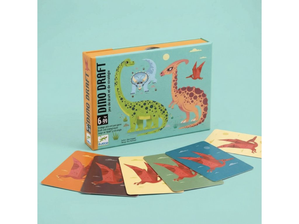 Kartová hra Dino DraftRýchla stratégia pre malých aj veľkých lovcov dinosaurovDino Draft je dynamická strategická kartová hra, v ktorej hráči využívajú princíp „vyber si a posuň ďalej“. Každý hráč si na začiatku tajne určí svojho dinosaura a farbu, ktoré bude počas hry zbierať. V každom kole si z balíčka kariet vyberá jednu, zvyšok posunie ďalej – a tak krok za krokom vytvára svoju víťaznú kombináciu. No pozor! To, čo necháte posunúť súperovi, môže rozhodnúť celú hru. Hráči získavajú body nielen za karty svojho zadania, ale aj za zadanie hráča po ľavej ruke – ak sa im podarí získať zodpovedajúce karty. Vďaka tomu má hra skvelú mieru napätia, stratégie aj prekvapení. Každý výber sa počíta!Prečo deti milujú Dino Draft?