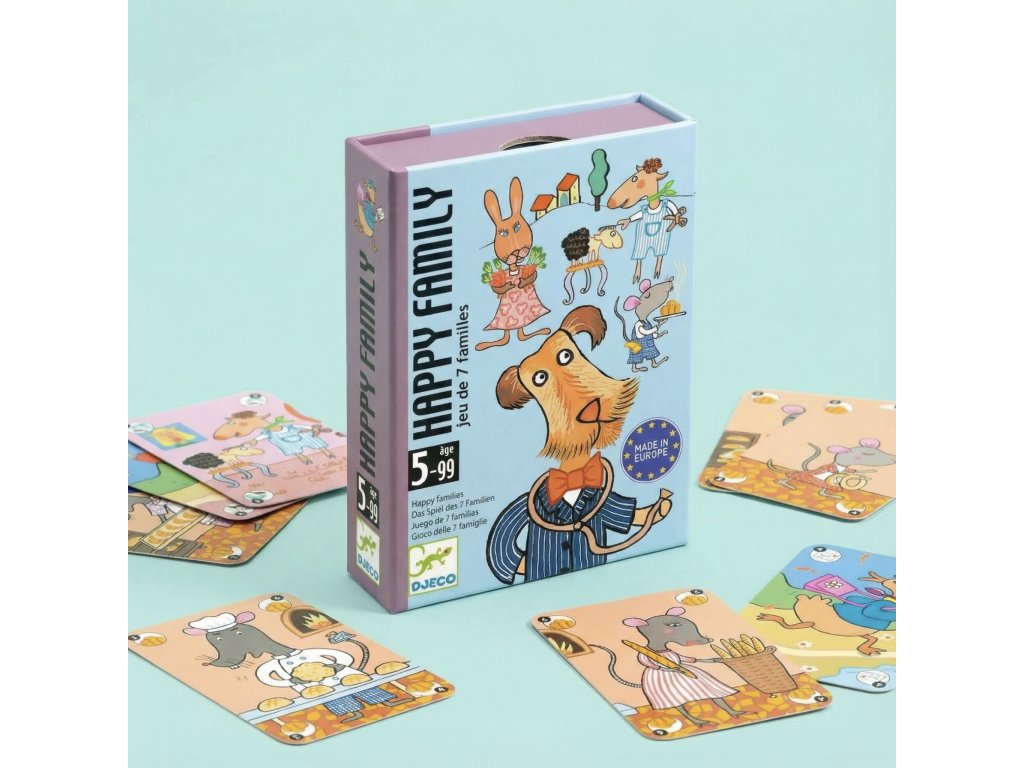 Kartová hra Happy Family Zbieraj celé rodinky a vyhraj najviac setovHappy Family je jednoduchá kartová hra na princípe kvarteta, ideálna ako prvá spoločenská hra pre deti. Cieľ je jasný: postupne si pýtaš karty od spoluhráčov a snažíš sa nazbierať čo najviac kompletných rodiniek.V hre nájdeš 7 rodín (veselé zvieratká) a každá rodina má 6 členov. Keď sa ti podarí poskladať celú rodinku, vyložíš ju pred seba. Hra je rýchla, zábavná a skvelá na tréning pamäte, komunikácie a pravidiel.Pre koho je vhodná: odporúčaný vek: od 5 rokov pre 2 – 5 hráčovObsah balenia 42 kariet (7 rodín po 6 členov) pravidlá hry