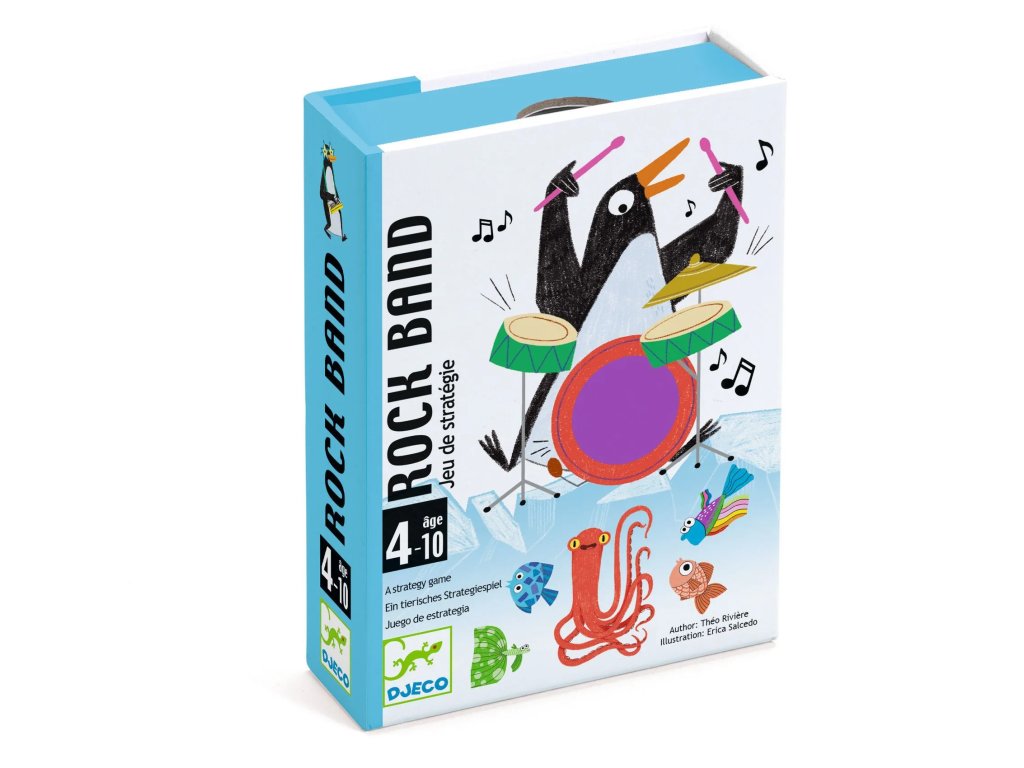 Vstúp do sveta hudby a stratégie s kartovou hrou Rocková kapela! Úlohou každého hráča je zostaviť vlastnú 4-člennú kapelu – bubeníka, klávesistu, basového gitaristu a speváka. Hráči si môžu postupne brať karty z centra stola, ak splnia podmienky – obľúbená potrava hudobníka, žolík alebo možnosť ukradnúť kartu od súperov. Ale pozor – v hre je iba jeden žolík a jedna šanca ukradnúť kartu!