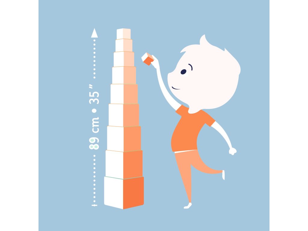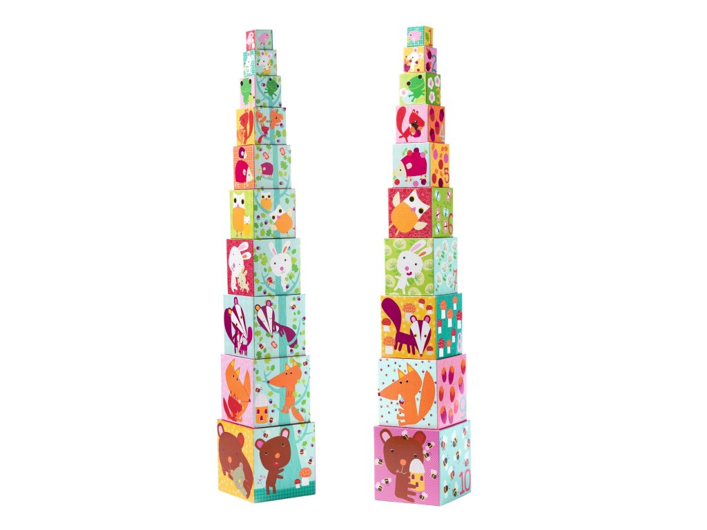 Kocky pyramída Lesné zvieratká sú stohovacie a vkladacie kocky z pevného kartónu, ktoré si deti skladajú od najväčšej po najmenšiu. Výsledkom je vysoká veža (pyramída), ktorú je radosť postaviť – a ešte väčšia zábava ju zrútiť a postaviť znova.