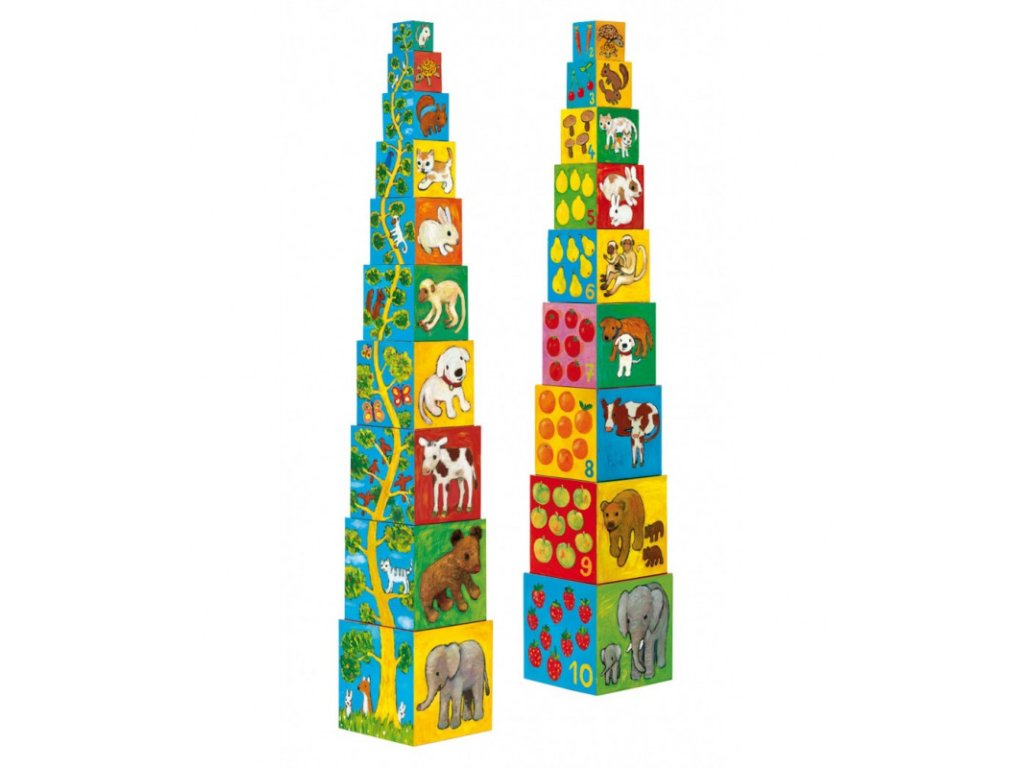 Kocky pyramída Zvieratká sú krásne ilustrované stohovacie a vkladacie kocky pre najmenších. Dieťa skladá kocky od najväčšej po najmenšiu a vytvorí vysokú vežu, ktorú môže s radosťou zrútiť a postaviť znova. Kocky sú z pevného, odolného kartónu, zároveň sú však ľahké – ideálne pre malé ruky.