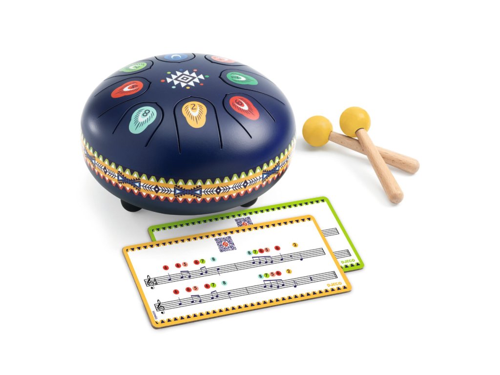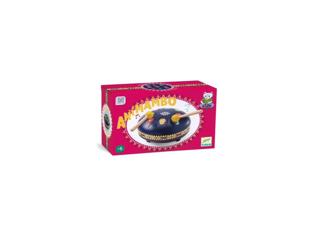 Kovový modrý bubon AnimamboObjavte zvuk a rytmus s indiánskym motívomFarebný kovový bubon od značky Djeco s 8 tónmi prináša deťom radosť z hudby a rytmu. Stačí udierať paličkami do jazykov a počúvať jemný, relaxačný zvuk. Ideálny pre prvé hudobné skúsenosti a rozvoj hudobného sluchu u detí od 5 rokov.Prečo si ho deti zamilujú?Intuitívny a ľahko hrateľný – každé dieťa zvládne hrať bez predchádzajúcich skúsenostíJemný a relaxačný zvuk podporuje koncentráciu a kreativitu8 jazykov zodpovedajúcich 8 tónom 1 jazyk = 1 nota = 1 očíslovaná a farebná nálepka poukazujúca na noty pre zahranie 4 hudobných skladiebGumový uzáver na spodku bubna umožňuje regulovať hlasitosť pre tichšie hranie.Prístup k 4 hudobným skladbám cez QR kód pre inšpiráciu a učenieRozvíja rytmus, sluch a prvé hudobné zručnosti detíObsah balenia:1 oceľový bubon (priemer 16 cm) s 8 jazykmi2 drevené paličky s gumenou špičkou (8,5 cm)2 obojstranné karty s notami (18 × 8,5 × 0,2 cm)