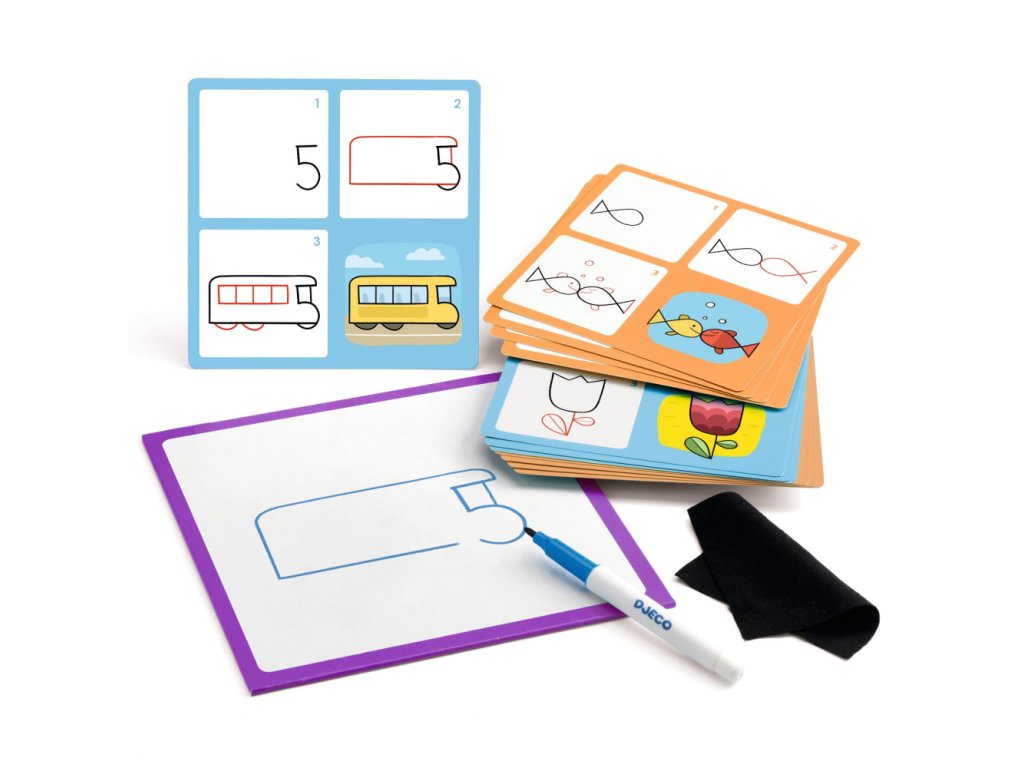 Kreslenie krok za krokom EduludoUčenie kreslenia hravou formou krok za krokomKreatívna edukačná sada z kolekcie Eduludo pomáha deťom zábavným spôsobom rozvíjať kresliarske zručnosti, jemnú motoriku a logické myslenie. Pomocou jednoduchých postupov sa dieťa učí kresliť obrázky krok za krokom, pričom do kresieb sú nápadito zapojené čísla a znaky. Kreslenie sa tak mení na objavovanie, ktoré deti prirodzene baví. Dieťa kreslí stierateľnou fixkou na pevnú lepenkovú dosku podľa predlohových kariet. Hotový obrázok môže jednoducho zotrieť handričkou a skúšať znova – bez stresu a s radosťou z opakovania.Prečo je táto sada skvelá pre deti:
