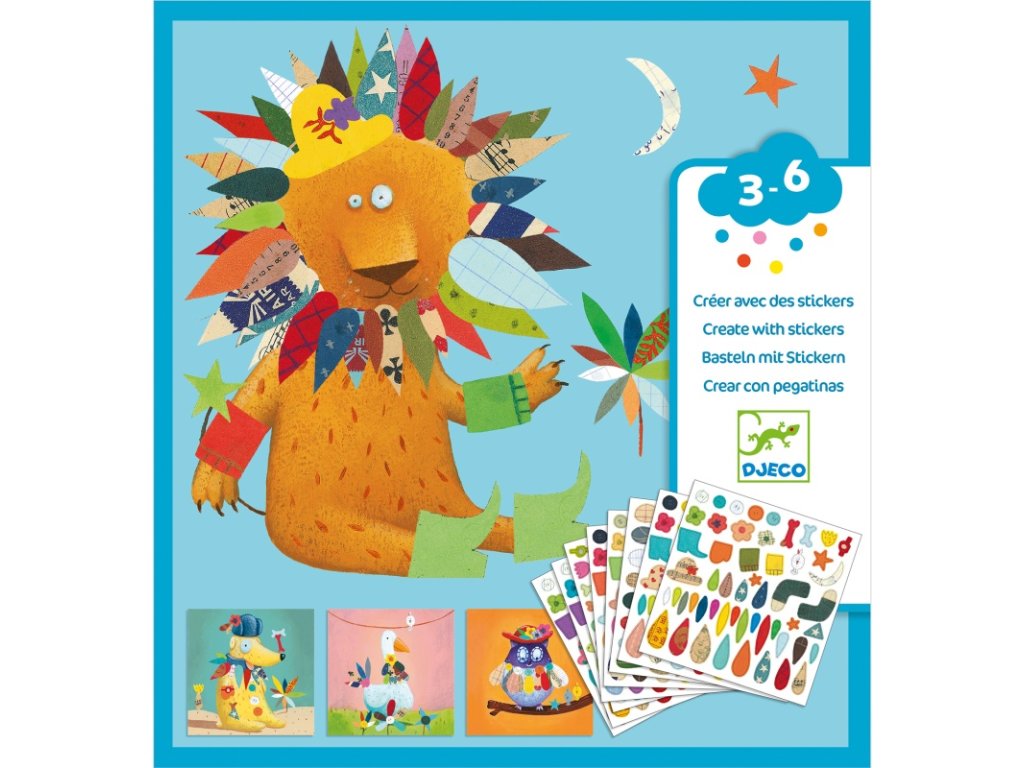 Lepenie obrázkov Zvieratká je tvorivá sada pre menšie deti, v ktorej sa obrázky dotvárajú jednoduchým a zábavným spôsobom – nalepovaním nálepiek. Dieťa si vyberie zvieratko na predlohe a postupne ho „oblieka“ do farebných detailov: pierok, kvetov, lístkov a ďalších ozdôb.