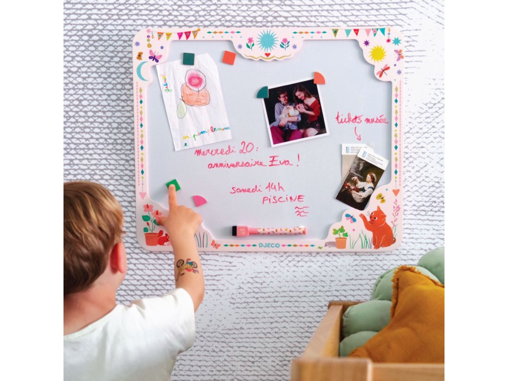 Magnetická tabuľka s fixkou Mačka Odkazy, kresby aj fotky na jednom mieste: magnetická tabuľka s mačičkou do detskej izbyMagnetická tabuľka Mačka je šikovná nástenka aj kresliaca plocha v jednom.Má kovový magnetický povrch v pevnom drevenom ráme a vďaka šnúrke na zavesenie si nájde miesto na stene v detskej izbe, v predsieni aj v kuchyni.Deti na ňu môžu písať a kresliť stierateľnou fixkou, rodičia zas rýchlo pripnú odkaz, rozvrh či obrázok pomocou magnetiek.Rýchly prehľad odporúčaný vek: od 5 rokov použitie: písanie, kreslenie, magnetická nástenka na odkazy a obrázky rozvíja: kreativitu, grafomotoriku, plánovanie a samostatnosť v balení: magnetická tabuľka, stierateľná fixka s magnetickou gumouPrečo si ju deti zamilujú môžu si vytvoriť „vlastný kútik“ na odkazy, kresby a nápady bez neporiadku – kreslí sa fixkou a ľahko sa zotrie mačičkový motív pôsobí milo – tabuľka je aj dekorácia pevné spracovanie a príjemné materiály na každodenné používanieTechnické parametre materiál: drevo, kov, plast (fixka) rozmery produktu: 46 × 38 × 1 cm rozmery balenia: 47 × 40,2 × 3 cm údržba: povrch čistite jemne vlhkou handričkou