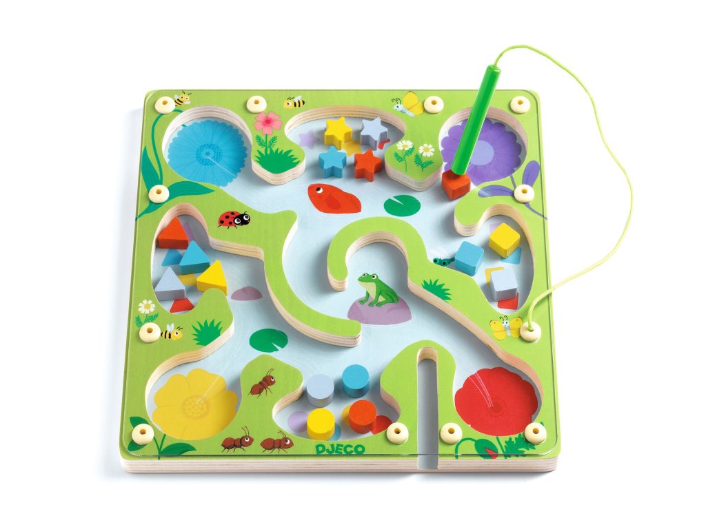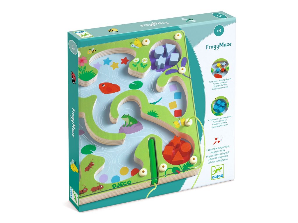 Magnetický drevený labyrint Žabka Magnetický labyrint na triedenie: farby a tvary v pohybeMagnetický drevený labyrint Žabka je magnetická hra, kde dieťa posúva dieliky po chodníčkoch labyrintu pomocou pera a triedi ich do správnych políčok podľa farby a tvaru.Rýchly prehľad odporúčaný vek: od 3 rokov téma: magnetický labyrint na triedenie dielikov podľa farby a tvaru rozvíja: logické myslenie, rozpoznávanie farieb a tvarov, jemnú motorikuPrečo si ho deti zamilujú dieliky ostávajú v labyrinte – ideálne aj na cesty zábavné triedenie farieb a tvarov v jednej hre podporuje sústredenie, logiku a jemnú motoriku magnetické pero sa dobre drží a motivuje k precíznostiAko sa hrá Vyberte dielik a pomocou magnetického pera ho posuňte po cestičkách. Nájdite správne políčko podľa farby alebo tvaru a „zaparkujte“ dielik. Skúšajte rôzne zadania: len farby, len tvary alebo kombináciu oboch.Obsah balenia 1× drevená hracia doska 16× pohyblivý dielik 1× magnetické peroTechnické parametre materiál: drevo (FSC®), magnet rozmer produktu: cca 22,5 × 22,5 × 1,5 cm
