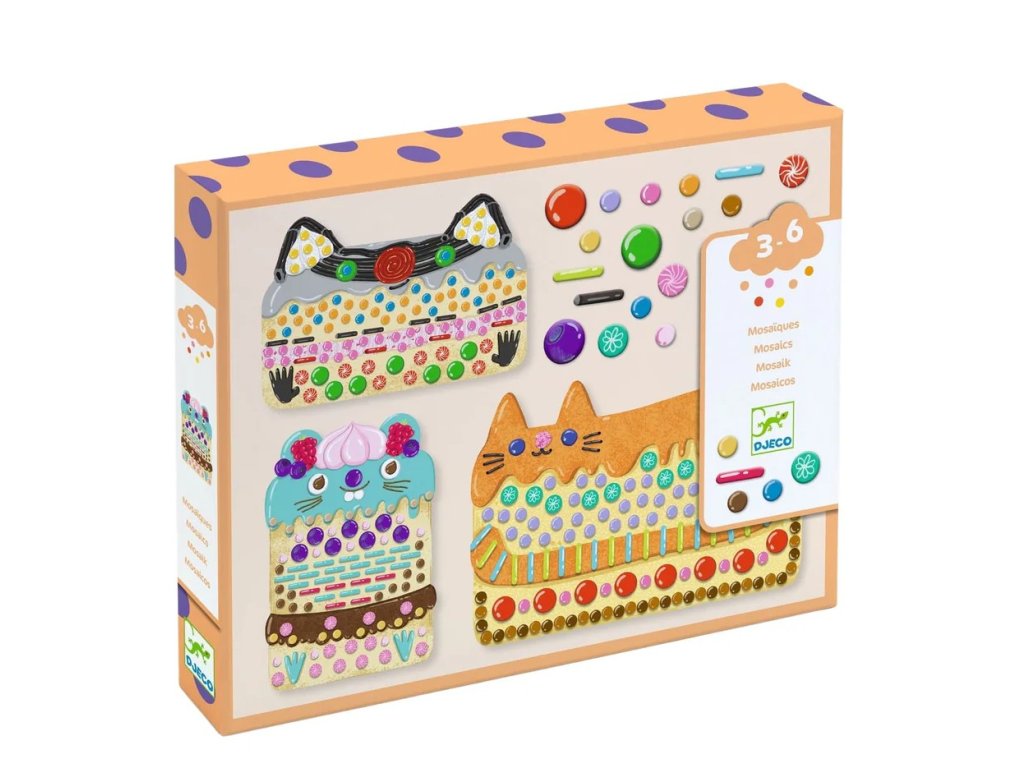Mozaika KoláčikyKreatívna sada pre malých predškolákovVstúpte do sveta sladkých dobrodružstiev s trojicou roztomilých koláčikov – mačkou, medvedíkom a myškou! Každý koláčik čaká na svoje farebné bonbóniky, ktoré deti nalepia z penových lepiek na pevné kartónové figurky. Nádherné ozdoby, ktoré by bolo takmer škoda zjesť! Sada obsahuje obrázkový návod krok za krokom, takže deti môžu postupovať ľahko a samostatne. Tento tvorivý proces nielen baví, ale zároveň rozvíja jemnú motoriku, trpezlivosť a koordináciu ruka–oko. Papier a lepenka použité na výrobu majú ekologický certifikát FSC®, takže tvorenie je zábavné aj šetrné k prírode.Obsah sady: