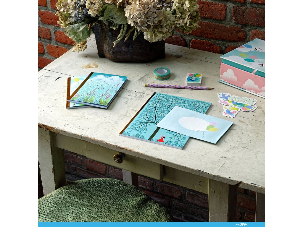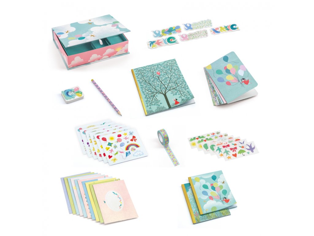 Súčasťou sú zápisníky v rôznych veľkostiach, kartičky s obálkami, samolepky, obtlačky a washi páska na zdobenie. Nechýba ani ceruzka a guma – a navyše záložky, ktoré si môžeš vložiť do obľúbenej knihy. Všetko je uložené v organizéri s vyberateľným priečinkom, aby sa drobnosti nestrácali.
