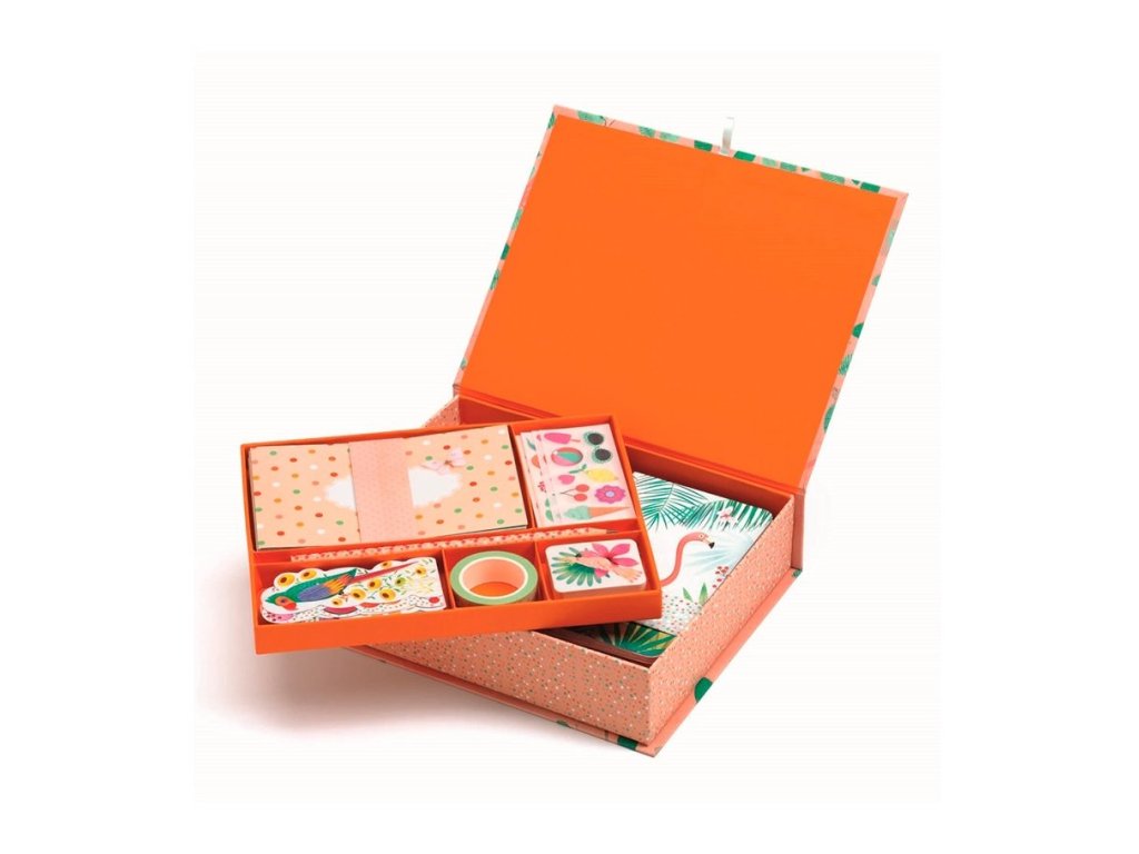 Súčasťou sú zápisníky v rôznych veľkostiach, kartičky s obálkami, samolepky, obtlačky a washi páska na zdobenie. Nechýba ani ceruzka a guma a praktické záložky. Všetko je uložené v organizéri s vyberateľným priečinkom, aby sa drobnosti nestrácali a tvorenie bolo vždy po ruke.