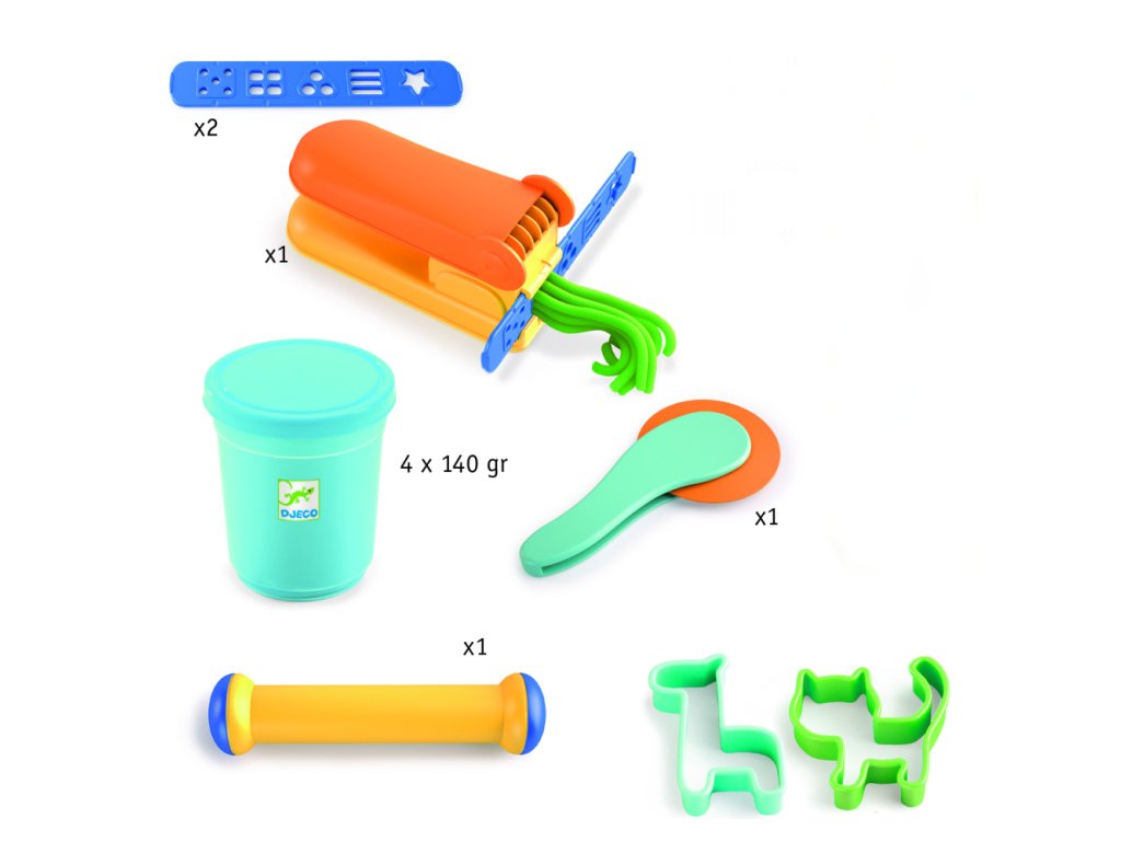 Plastelína s vykrajovačkami Štartovacia sada na nekonečnú zábavu s plastelínou pre batoľatá Obsahuje 4 kelímky voňavej plastelíny v pop farbách a plastové náradie na vaľkanie, krájanie, vykrajovanie a lisovanie. Valčekom dieťa vyvaľká plastelínovú placku. Valček má hrubé vysoké konce, aby vznikla rovnomerná placka. Placku nakrája kolieskom alebo z nej formičkami vykrojí zvieratká či geometrické tvary. Lisom vyrobí plastelínové šúľančeky rôznych tvarov - pomocou šablón vzniknú šúľančeky hviezdičkové, srdiečkové, vlnkové a iné. Mäkučká plastelína a bezpečné odolné náradie sú vhodné pre rúčky batoliat. Modelovanie z plastelíny účinne podporuje rozvoj jemnej motoriky.Plastelína nezanecháva farebné škvrny. Pozor, vysychá na vzduchu! Po ukončení činnosti ju odložte do kelímka a zatvorte, aby zostala vláčna. Výhody vysychania na vzduchu: ak sa plastelína dostane niekam, kde nemá byť, vyschnutú ju ľahko odstránite. Keď sa vám podarí výtvor, ktorý si chcete ponechať, môžete ho nechať vyschnúť a stvrdne. S kreatívnymi sadami na tvorenie s plastelínou sa dieťa oboznámi s hravým využitím plastelíny.Obsah: 4 kelímky voňavej plastelíny (farby pop: oranžová, zelená, žltá, modrá a 140 g), 1 lis, 2 šablóny na lis, 1 krájacie koliesko, 1 valček, 12 vykrajovacích formičiek.