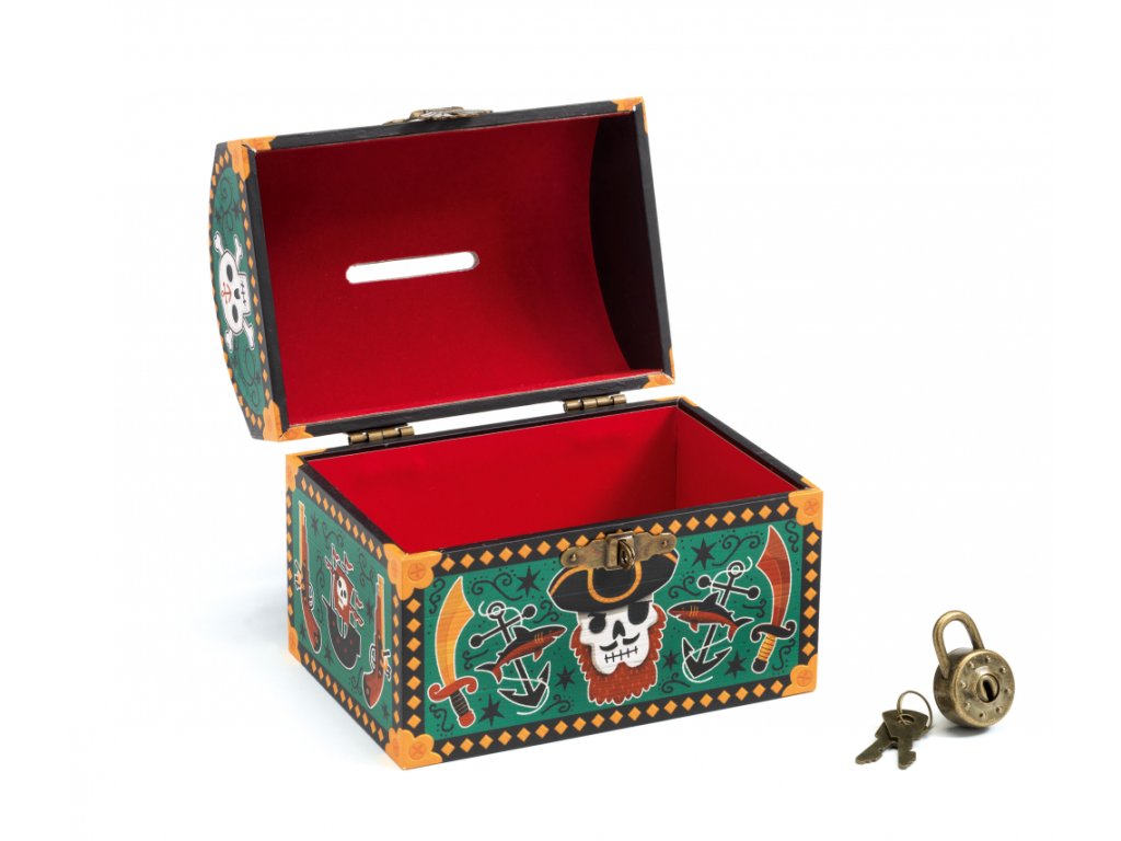 Veko sa uzatvára na visací zámok a v balení nájdeš 2 kľúčiky – poklady tak zostanú naozaj „tajné“. Vo vnútri je jedna väčšia priehradka, takže okrem mincí sa sem zmestia aj drobné spomienky, nájdené kamienky či malé pirátske „poklady“.