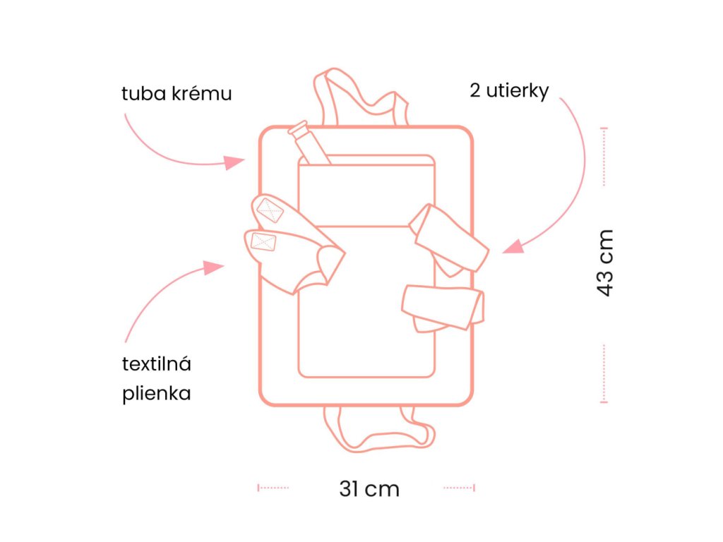 Vnútri nájdete aj malé príslušenstvo na starostlivosť: látkovú plienku, 2 utierky a tubu krému. Taška má vnútorné vrecko, aby sa doplnky nestrácali, a vďaka pevnému spracovaniu sa ľahko prenáša aj malým detským rukám.