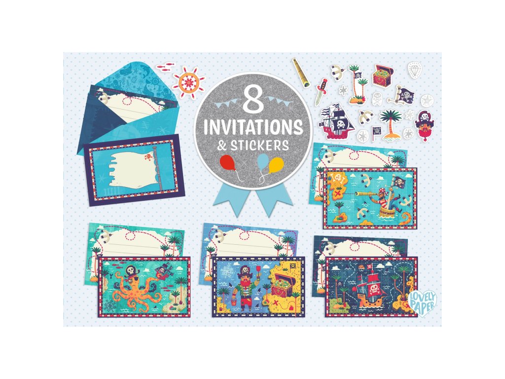 Pozvánky & samolepky PirátiVeselá pirátska sada na oslavy a tvoreniePiráti – 8 pozvánok a samolepiek je zábavná sada pre deti, ktorá obsahuje 8 farebných pozvánok s pirátskou témou, 8 ilustrovaných obálok a samolepky na ich ozdobenie. Sada je ideálna na narodeninové oslavy, tematické párty alebo na tvorivé aktivity.Každý dizajn má metalické detaily a matnú potlač.Prečo si vybrať sadu od Djeco8 pozvánok s pirátskym motívomsamolepky na ozdobenieskvelé na oslavy a tvorivé hryObsah balenia8 kusov pozvánok s pirátskymi ilustráciami8 obálok2 hárky samolepiek na zdobenie