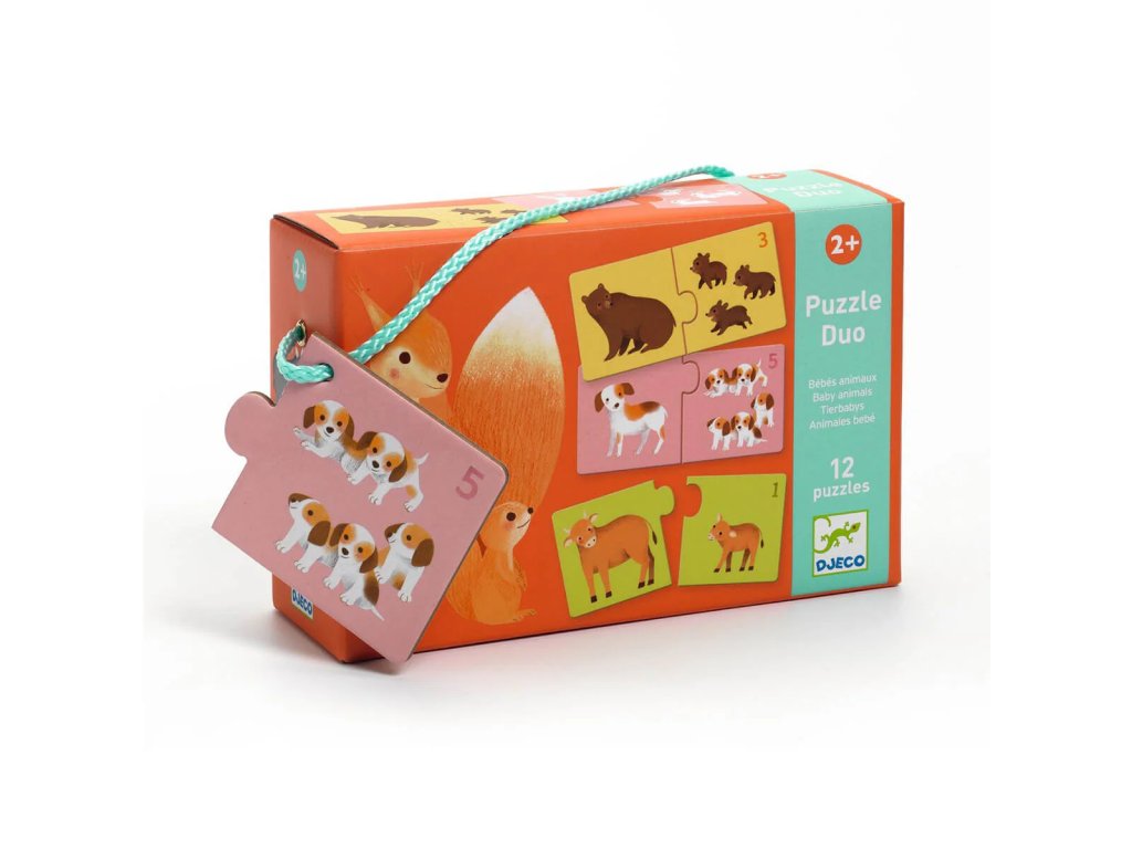 Puzzle duo Mláďatá Edukačné puzzle pre batoľatá Sada obsahuje 12 dvojdielnych puzzle (spolu 24 dielikov) na priraďovanie mláďat a mám zvieratiek. Koľko mláďat má mama? Ich počet je na dielikoch vyznačený číslom. Puzzle sú autokorekčné (dajú sa spojiť len príslušné dieliky rovnakej farby) a dieťa môže skladať samostatne. Dieťa spoznáva zvieratká, rozlišuje farby a učí sa počítať.Dieliky sú veľké a odolné - veríme, že z nich budete mať dlho radosť.Puzzle je balené v pekne ilustrovanej škatuli s praktickým povrázkom na nosenie.Vyrobené z lepenky a papiera s ekologickým certifikátom FSC®.Obsah: 24 dielikov.Rozmery puzzle: 14 x 7 cm.