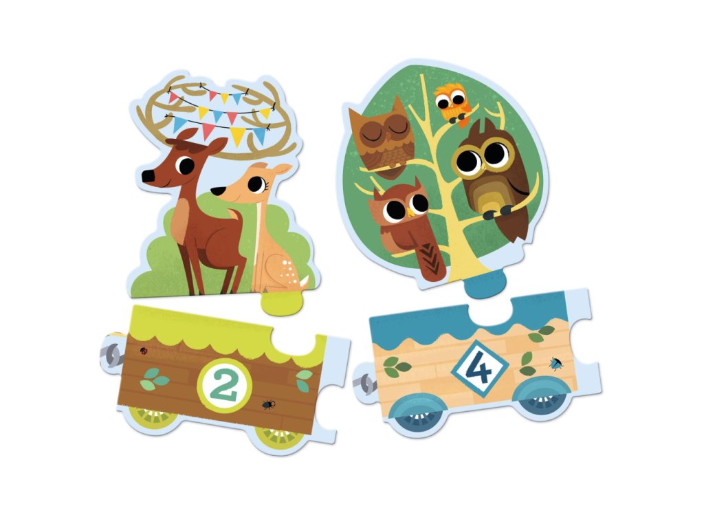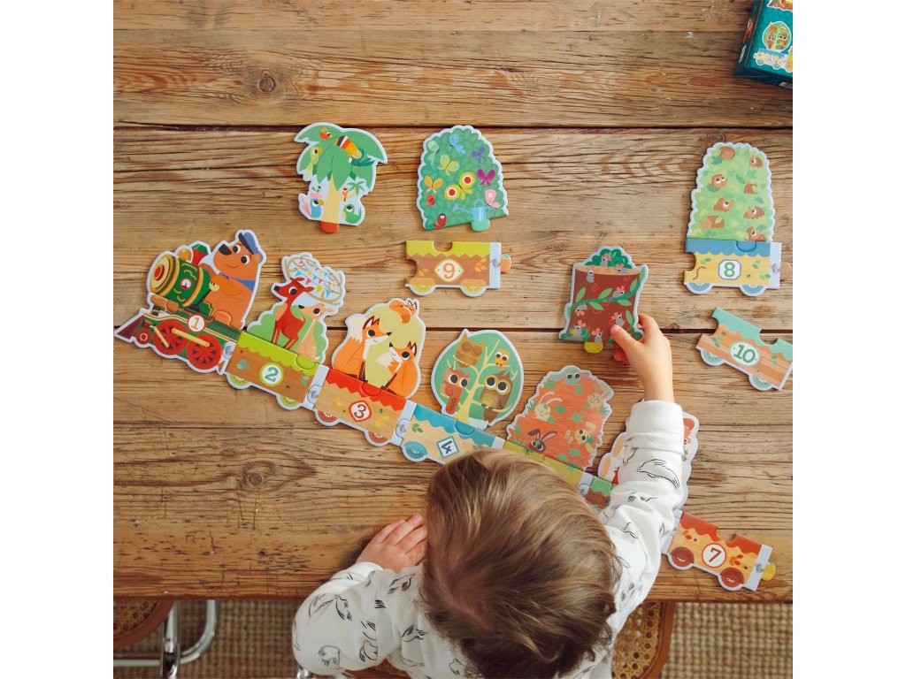 Puzzle Počítam 20 ks Edukačné puzzle na spoznávanie čísiel a množstva vyjadreného číslami Puzzle obsahuje 10 dvojdielnych puzzle, ktoré sa dajú spojiť do dlhého vláčika s lokomotívou a vagónmi. Rušeň a vozne sú očíslované od 1 do 10 a vozia daný počet zvieratiek. Puzzle je autokorekčné (dajú sa spojiť len príslušné dieliky) a dieťa môže skladať samostatne.Dieliky sú veľké a odolné - veríme, že z nich budete mať dlho radosť.Puzzle je balené v pekne ilustrovanej škatuli s praktickým povrázkom na nosenie.Vyrobené z lepenky a papiera s ekologickým certifikátom FSC®.Rozmery: 120 cm (dĺžka) x 16 (výška) cm.