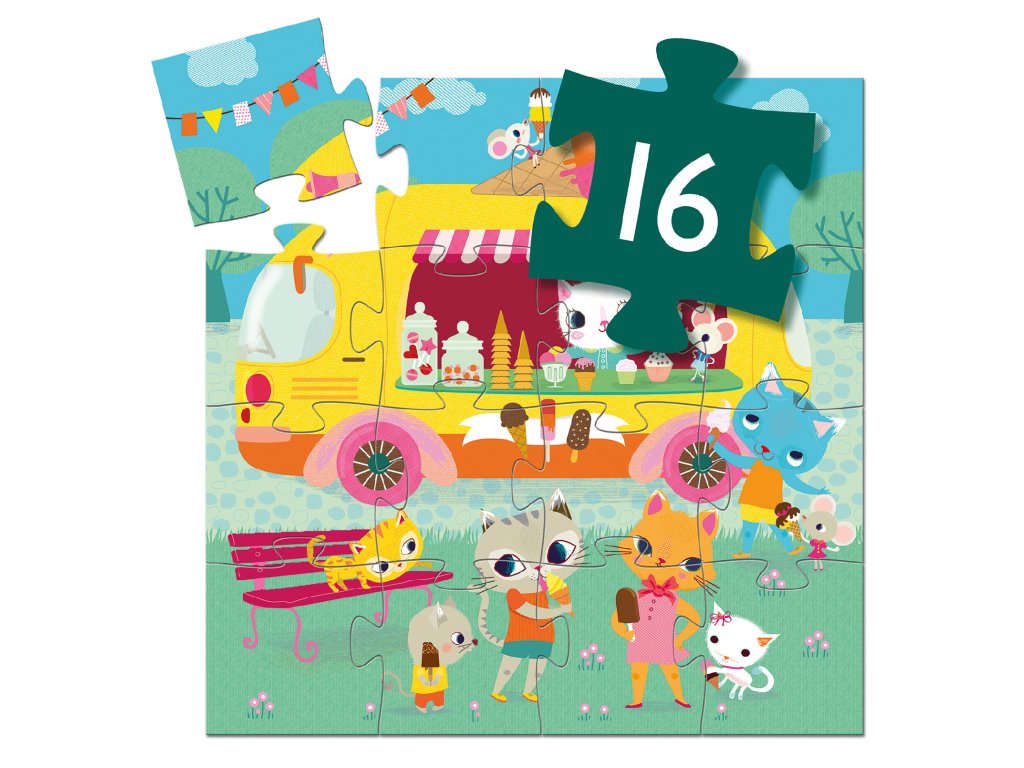 Puzzle Pojazdná zmrzlináreň 16 ks Letná pohoda na jednom obrázku: poskladaj 16 veľkých dielikov a privolaj zmrzlinu do parkuPuzzle Pojazdná zmrzlináreň je veselé puzzle pre predškolákov, ktoré deti prenesie do horúceho dňa plného maškrtenia.Po zložení 16 veľkých dielikov vznikne štvorcový obrázok 25 × 25 cm s pojazdnou zmrzlinárňou a drobnými detailmi, ktoré sa oplatí hľadať.Puzzle je uložené v tvarovanej siluetovej krabičke v podobe zmrzlinárskeho auta – na streche má pohyblivý prvok, ktorý deti baví aj mimo skladania.Rýchly prehľad odporúčaný vek: od 3 rokov počet dielikov: 16 rozvíja: jemnú motoriku, koordináciu oko–ruka, trpezlivosť, sústredenie v balení: 16 dielikov + siluetová krabička s pohyblivým detailomPrečo si ho deti zamilujú veľké dieliky sa dobre držia a ľahko skladajú ilustrácia je plná milých detailov – podporí rozprávanie a fantáziu krabička v tvare auta je praktická aj krásna na poličke vyrobené z FSC papiera a kartónu – odolné na opakované skladanieAko sa s tým hrá Vysyp dieliky a otoč ich obrázkom nahor. Začni okrajmi a potom dopĺňaj stred podľa farieb a tvarov. Hotový obrázok si prezrite a hľadajte, kto všetko si prišiel po zmrzlinu.Obsah balenia 16× dielik puzzle 1× siluetová krabička v tvare pojazdnej zmrzlinárne (s pohyblivým prvkom)Technické parametre rozmer zloženého puzzle: 25 × 25 cm materiál: papier a kartón (FSC) rozmery balenia: približne 21,8 × 11,3 × 5 cm