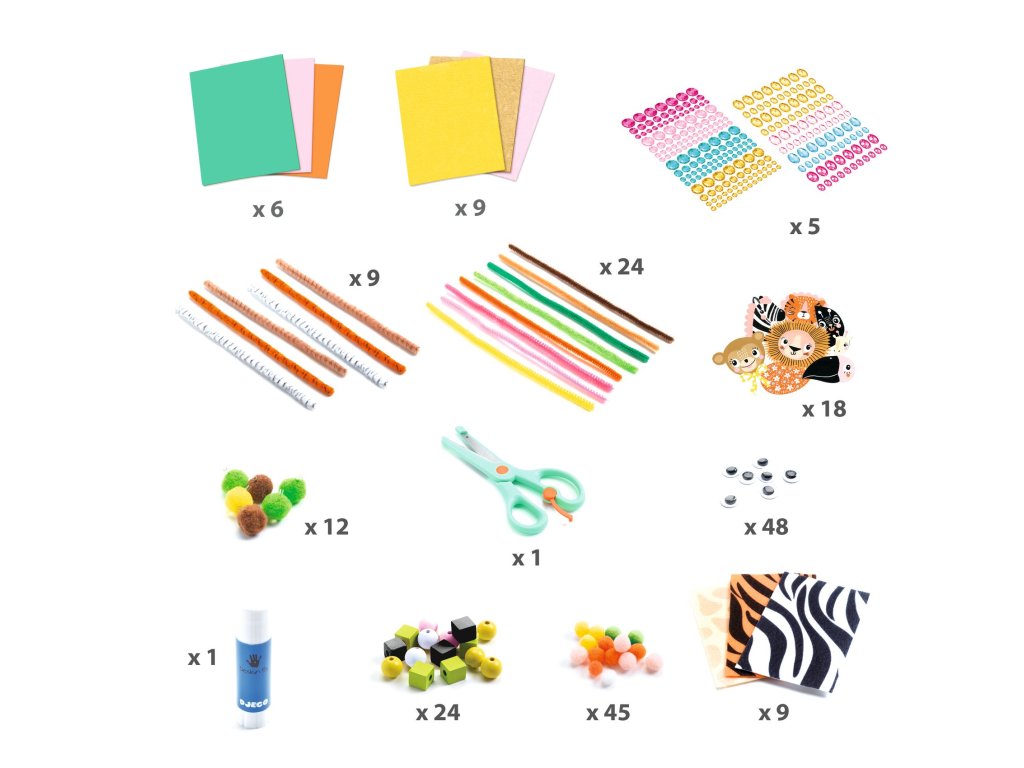 Sada dekoratívne tvorenie Džungle Džungľa plná nápadov: strihaj, lep a skladaj vlastné zvieratká z filcu, brmbolcov a korálikovSada dekoratívne tvorenie Džungle je veľký kreatívny box pre malé deti, ktoré milujú vyrábať a skúšať nové materiály.V jednej krabici nájdeš všetko potrebné na tvorenie – od filcu a penových dielikov až po brmbolce, koráliky a chlpaté drôtiky.Deti môžu podľa predlôh vytvárať roztomilé džungľové zvieratká a potom ich ďalej dozdobovať podľa vlastnej fantázie.Rýchly prehľad odporúčaný vek: 3–6 rokov rozvíja: jemnú motoriku, koordináciu oko–ruka, kreativitu, trpezlivosť, sústredenie aktivity: strihanie, lepenie, navliekanie, skladanie a dekorovaniePrečo si ju deti zamilujú veľa materiálu na dlhé tvorenie – zakaždým môže vzniknúť iný zvierací kamarát kombinovanie textúr (filc, pena, brmbolce) je pre deti zmyslovo zábavné praktické aj na spoločné tvorenie – v krabici je dosť dielikov pre viac detí obsahuje pomôcky na tvorenie – nožnice a lepidlo sú súčasťou baleniaAko sa s tým hrá Vyber si jednu z predrezaných ilustrovaných kartičiek ako základ. Dotvor telo zvieratka pomocou filcu a penových dielikov. Pridaj detaily: koráliky, brmbolce a chlpaté drôtiky (napr. chvost, fúziky, ozdoby). Nalep samolepiace očká a dozdob „šperkami“ pre extra efekt. Hotové výtvory si vystav alebo ich použi pri hre na džungľu.Obsah balenia 10× predrezaná ilustrovaná kartička 18× filcový list 6× penový list 24× drevená korálka 45× brmbolec 33× chlpatý (ženilkový) drôtik samolepiace očká samolepiace ozdoby 1× detské nožnice 1× lepidlo 10× list s nápadmi (inšpirácie krok za krokom)Technické parametre materiál: papier/kartón, filc, pena, drevo, dekoratívne prvky vek: 3–6 rokov rozmery balenia: približne 23 × 23 × 4 cm poznámka: pri strihaní odporúčame dohľad dospelej osoby