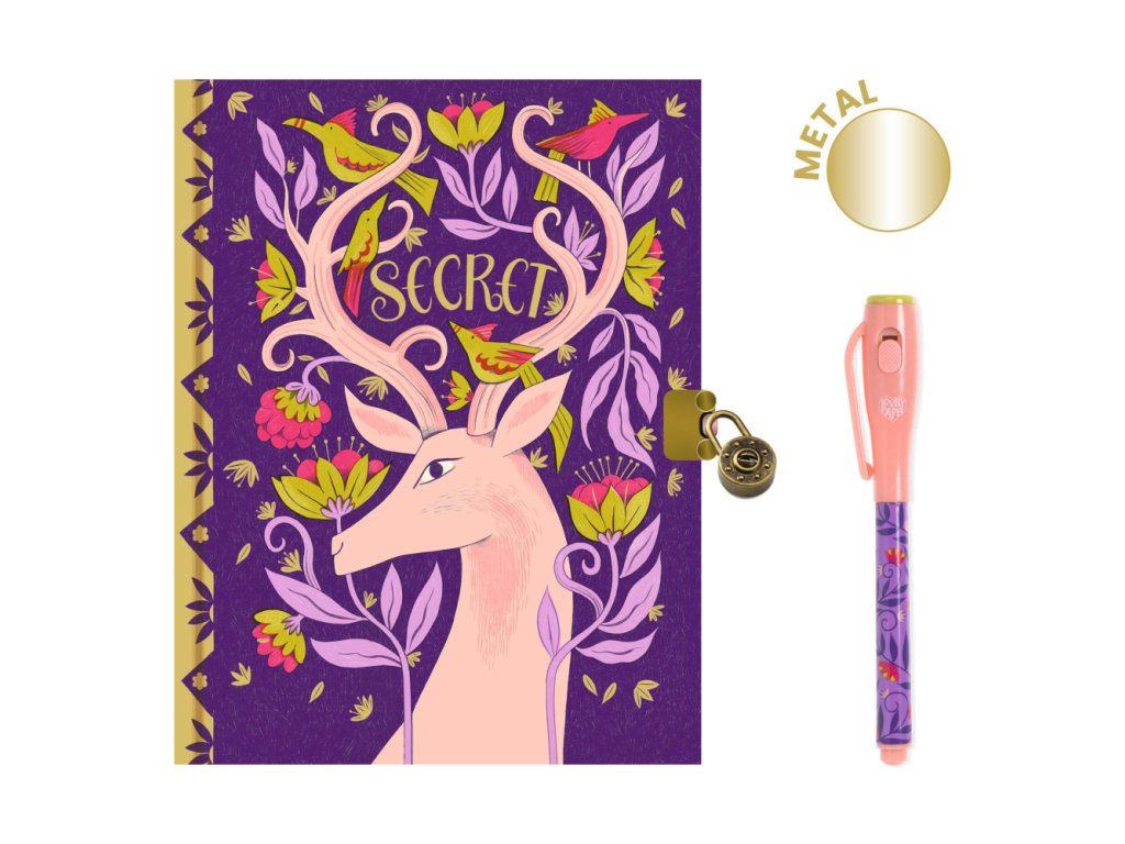 Tajný zápisník s magickým perom Jeleň Perfektná sada na písanie denníka: linajkový zápisník s visacím zámkom a 2 kľúčikmi a čarovné pero. Tvrdá obálka s ilustráciou jeleňa s kvetovou ornamentikou je doplnená metalickým leskom. Strany zdobí malá ilustrácia. Kvalitný papier s vysokou gramážou 120 gsm (t. j. vyššou než štandardný kancelársky papier) má ekologický certifikát FSC®.Súčasťou sady je čarovné pero s neviditeľným atramentom, ktorý sa ukáže len pod UV svetlom! UV svetlo je vo vrchnáku pera, spolu s tlačidlom na zapnutie/vypnutie svetla a 3 gombíkovými batériami LR44 HD. Vrchnák má praktický klips na pripnutie pera na zošit. Pero má fixkový hrot. Farebné telo pera ladí so zápisníkom.Pre radosť zo zapisovania a tajomstiev!Balené v priehľadnom obale. Batérie sú súčasťou balenia, priamo vo vrchnáku pera.Obsah: zápisník s tvrdou obálkou, visací zámok, 2 kľúčiky, 1 čarovné pero s tlačidlom na zapnutie/vypnutie UV svetla a 3 gombíkovými batériami LR44 HDOdporúčaný vek: 8+ rokovRozmery zápisníka: 15,5 x 20 x 1,2 cm