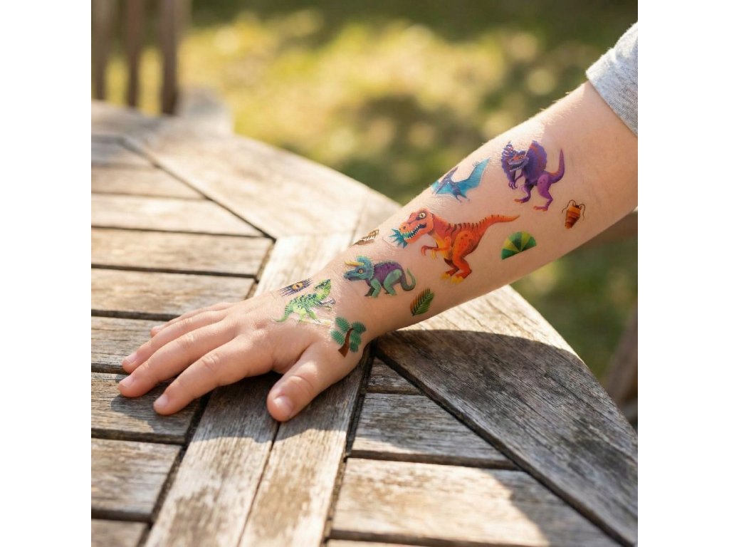 Tetovačky Dinosaury Krásne dinosaurie tetovačky pre deti 2 hárky dočasných tetovačiek s ostrými ilustráciami pravekých jašterov a rastlín. Jednotlivé tetovačky sa z hárkov ľahko vytrhávajú. Aplikácia: odstráňte fóliu, priložte tetovačku na kožu, navlhčite podkladový papier, jemne pritlačte, papier stiahnite. Tetovačky sú dermatologicky testované. Po obnosení odstráňte mydlovou vodou alebo jemným odličovacím prípravkom. Obsah: 50+ ks na 2 hárkoch, návod na použitie