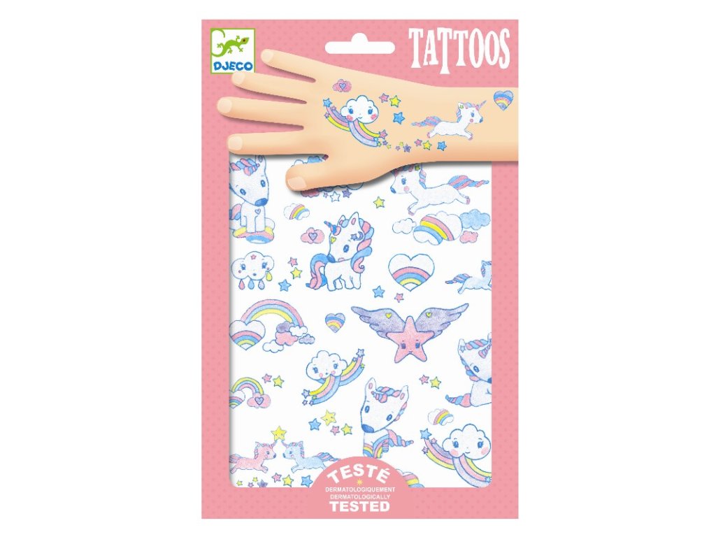 Tetovačky Jednorožce Krásny tetovačky s jednorožcami pre všetkých drobcov. 2 hárky dočasných tetovačiek s milučkými ilustráciami malých jednorožcov a ďalších ľúbezných motívov. Deti navyše poteší trblietavý lesk. Jednotlivé tetovačky sa z hárkov ľahko vytrhávajú. Aplikácia: odstráňte fóliu, priložte tetovačku na kožu, navlhčite podkladový papier, jemne pritlačte, papier stiahnite. Po obnosení odstráňte mydlovou vodou alebo jemným odličovacím prípravkom. Tetovačky sú dermatologicky testované.Obsah: 50+ ks na 2 hárkoch, návod na použitie