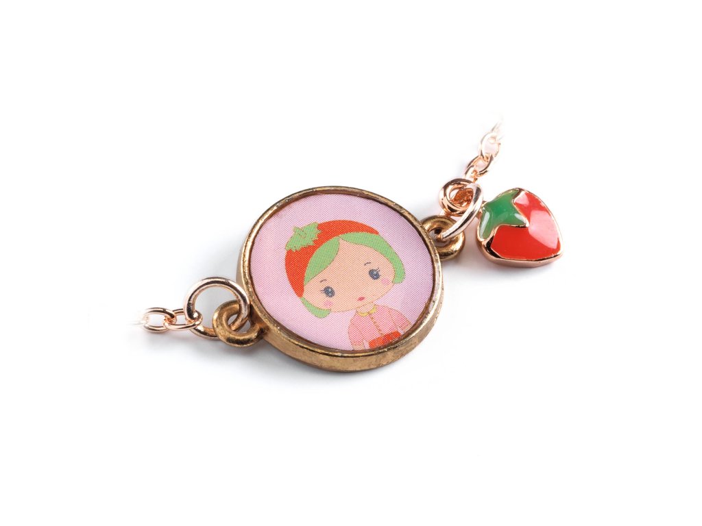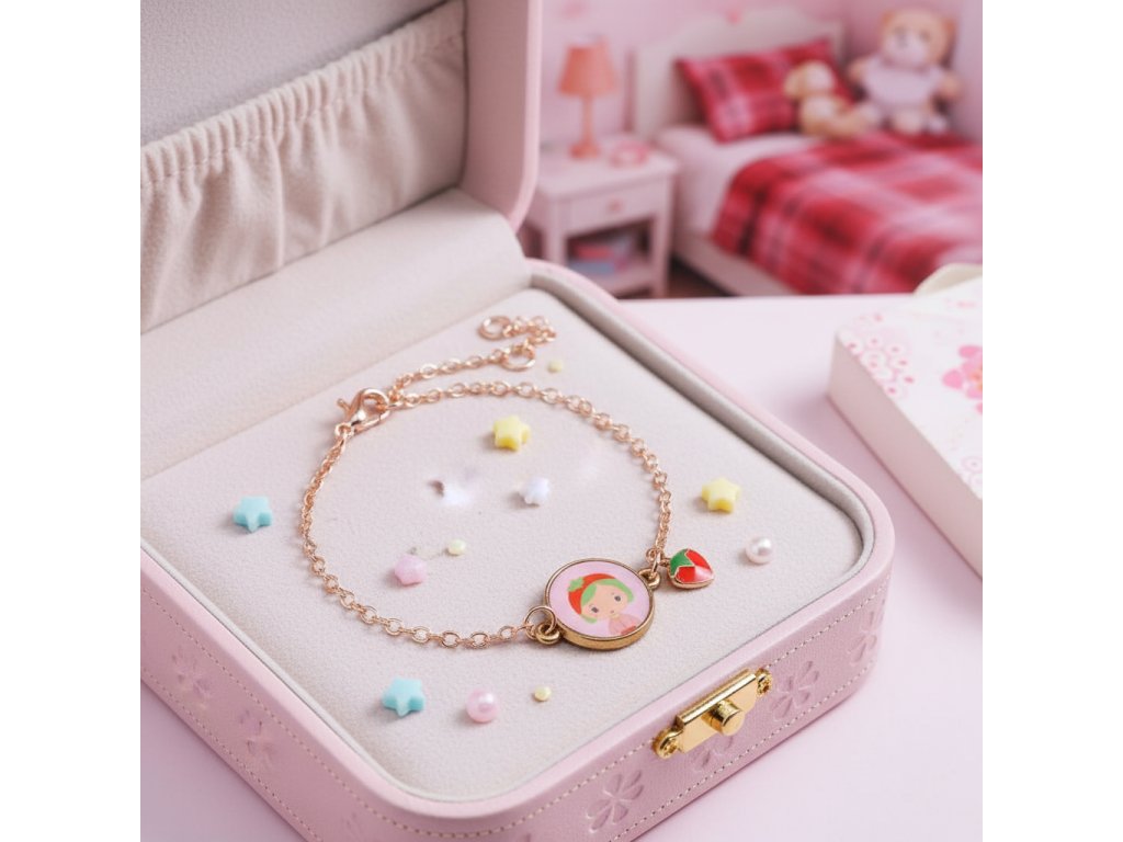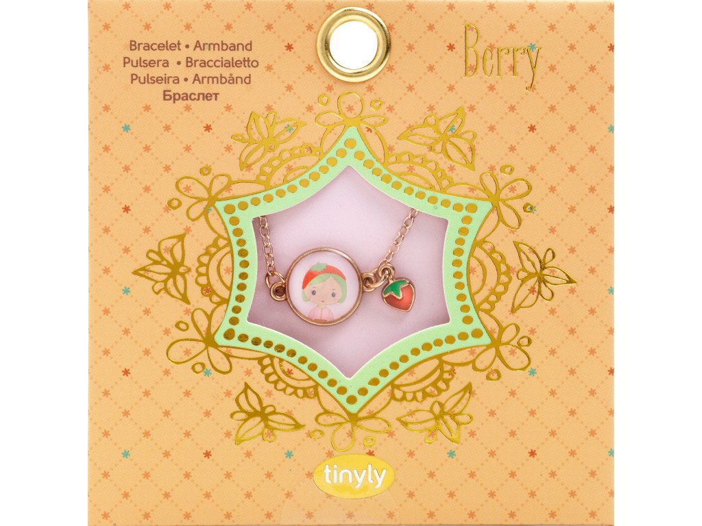 Tinyly náramok Berry Jahôdková bodka: Tinyly náramok Berry ako sladký doplnokTinyly náramok Berry je jemný detský náramok z kolekcie Tinyly. Na pozlátenej kovovej retiazke visí ilustrovaný medailónik s portrétom postavičky a k nemu ladiaca ozdôbka – prívesok v tvare jahôdky.Ovocný detail pôsobí hravo a milo. Vďaka nastaviteľnému zapínaniu sa dá veľkosť jednoducho prispôsobiť detskému zápästiu.Rýchly prehľad odporúčaný vek: od 4 rokov typ: detský náramok s medailónikom a príveskom materiál: kovová retiazka (pozlátený vzhľad), ilustrované prvky dĺžka retiazky: cca 18 cm veľkosť medailónika: Ø 13 mm balenie: darčekové kartónové puzdro s okienkomPrečo si ho deti zamilujú jemný šperk, ktorý pôsobí „dospelácky“, no stále hravo medailónik s postavičkou Tinyly – každý model má svoj príbeh praktické zapínanie – náramok sa dá prispôsobiť krásny tip na malý darček (oslava, odmena, „len tak“)Obsah balenia 1× náramok (kovová retiazka so zapínaním) 1× ilustrovaný medailónik 1× prívesok (prívesok v tvare jahôdky)Technické parametre zapínanie: nastaviteľné (karabínka + očká) dĺžka retiazky: cca 18 cm medailónik: Ø 13 mm rozmery balenia: cca 9 × 9 × 0,2 cm