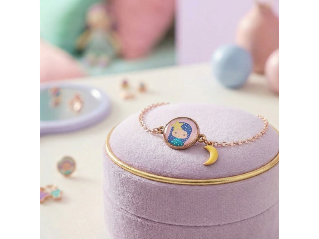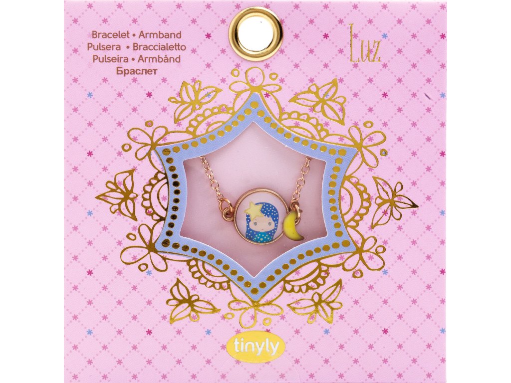 Tinyly náramok Luz Snový mesiac: Tinyly náramok Luz s medailónikom a príveskomTinyly náramok Luz je jemný detský náramok z kolekcie Tinyly. Na pozlátenej kovovej retiazke visí ilustrovaný medailónik s portrétom postavičky a k nemu ladiaca ozdôbka – prívesok v tvare mesiaca.Motív mesiaca dodá náramku jemnú „snovú“ atmosféru – pekne vynikne samostatne aj v kombinácii s ďalšími šperkami. Vďaka nastaviteľnému zapínaniu sa dá veľkosť jednoducho prispôsobiť detskému zápästiu.Rýchly prehľad odporúčaný vek: od 4 rokov typ: detský náramok s medailónikom a príveskom materiál: kovová retiazka (pozlátený vzhľad), ilustrované prvky dĺžka retiazky: cca 18 cm veľkosť medailónika: Ø 13 mm balenie: darčekové kartónové puzdro s okienkomPrečo si ho deti zamilujú jemný šperk, ktorý pôsobí „dospelácky“, no stále hravo medailónik s postavičkou Tinyly – každý model má svoj príbeh praktické zapínanie – náramok sa dá prispôsobiť krásny tip na malý darček (oslava, odmena, „len tak“)Obsah balenia 1× náramok (kovová retiazka so zapínaním) 1× ilustrovaný medailónik 1× prívesok (prívesok v tvare kosáka mesiaca)Technické parametre zapínanie: nastaviteľné (karabínka + očká) dĺžka retiazky: cca 18 cm medailónik: Ø 13 mm rozmery balenia: cca 9 × 9 × 0,2 cm