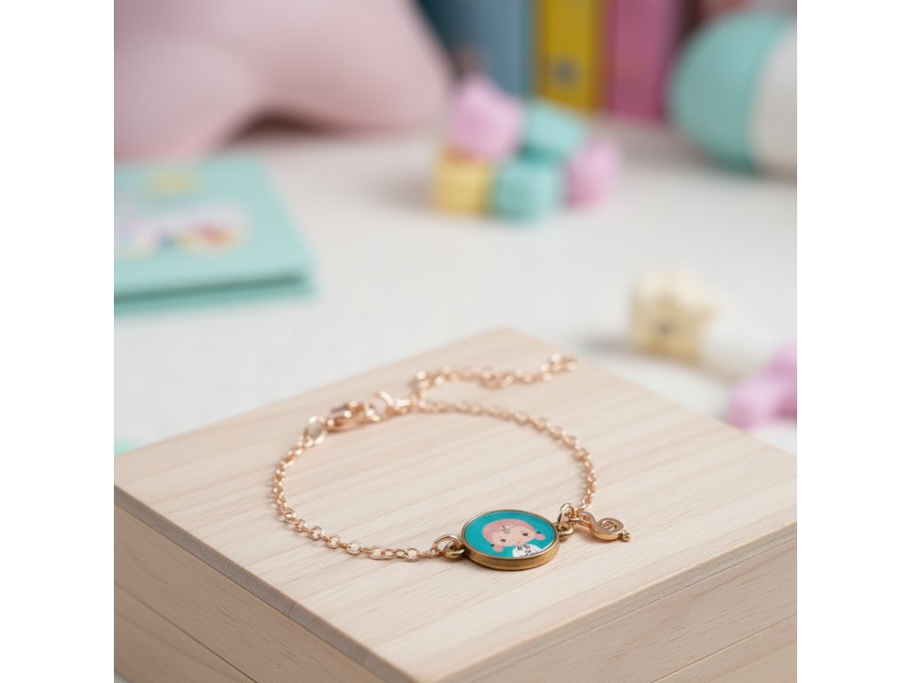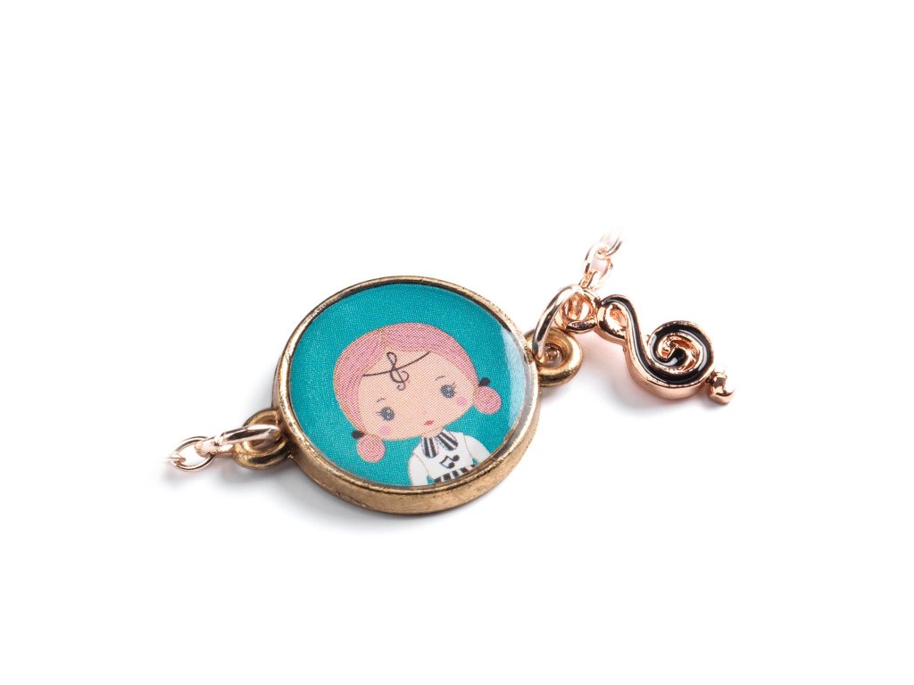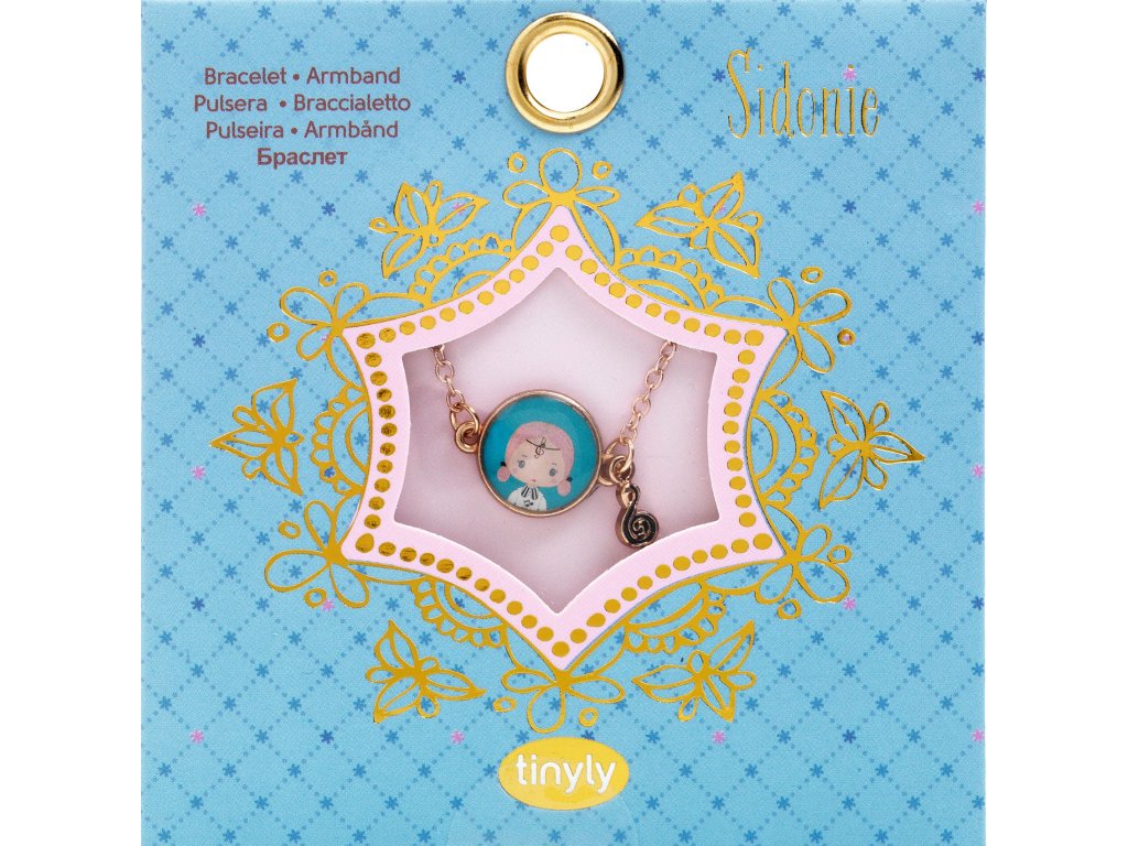 Tinyly náramok Sidonie Jemný náramok Tinyly s medailónikom SidonieTinyly náramok Sidonie je jemný detský náramok z kolekcie Tinyly. Na pozlátenej kovovej retiazke visí ilustrovaný medailónik s portrétom postavičky a k nemu ladiaca ozdôbka – prívesok v tvare husľového kľúča.Hudobný detail z neho robí náramok, ktorý pôsobí ľahko a elegantne – skvelý na každý deň aj na oslavu. Vďaka nastaviteľnému zapínaniu sa dá veľkosť jednoducho prispôsobiť detskému zápästiu.Rýchly prehľad odporúčaný vek: od 4 rokov typ: detský náramok s medailónikom a príveskom materiál: kovová retiazka (pozlátený vzhľad), ilustrované prvky dĺžka retiazky: cca 18 cm veľkosť medailónika: Ø 13 mm balenie: darčekové kartónové puzdro s okienkomPrečo si ho deti zamilujú jemný šperk, ktorý pôsobí „dospelácky“, no stále hravo medailónik s postavičkou Tinyly – každý model má svoj príbeh praktické zapínanie – náramok sa dá prispôsobiť krásny tip na malý darček (oslava, odmena, „len tak“)Obsah balenia 1× náramok (kovová retiazka so zapínaním) 1× ilustrovaný medailónik 1× prívesok (prívesok v tvare hudobnej noty (husľový kľúč))Technické parametre zapínanie: nastaviteľné (karabínka + očká) dĺžka retiazky: cca 18 cm medailónik: Ø 13 mm rozmery balenia: cca 9 × 9 × 0,2 cm