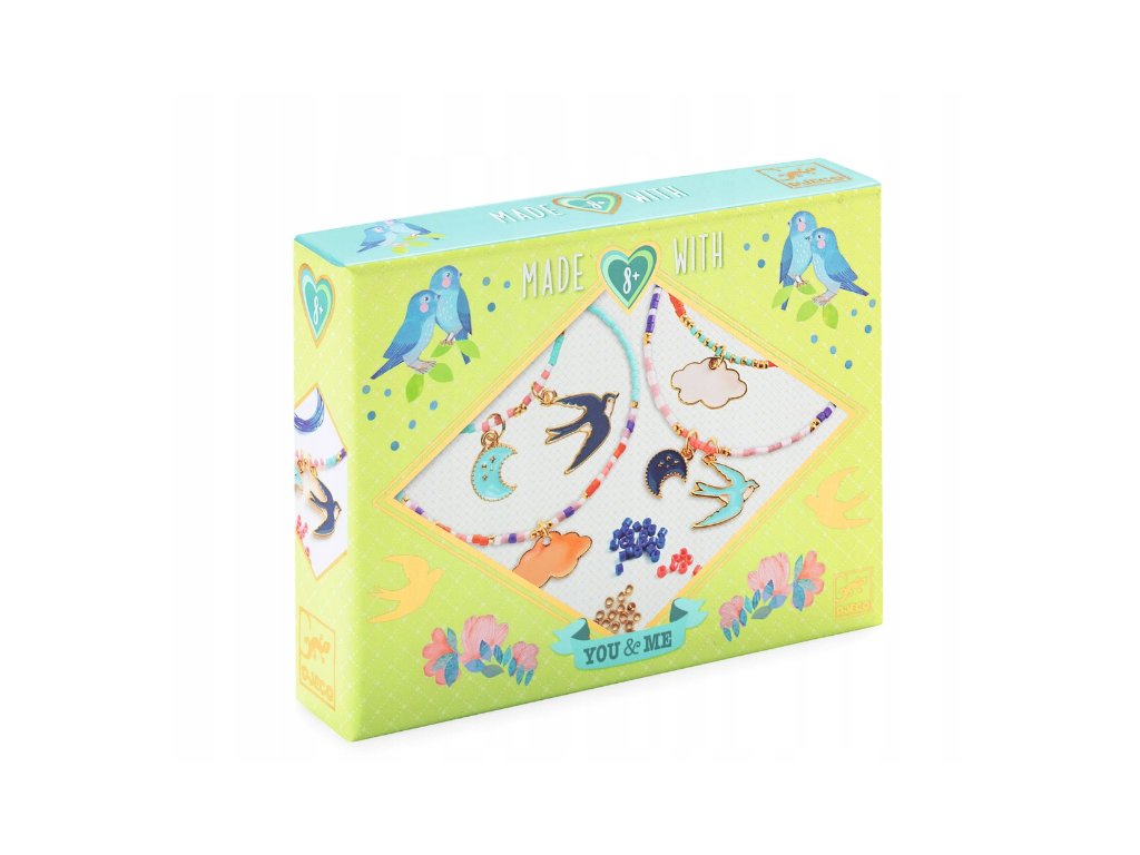 Sada obsahuje množstvo zladených korálok a prívesky s motívmi oblohy (napr. vtáčik, obláčik, mesiačik), vďaka ktorým budú náramky pôsobiť ako malý šperk. Hotové náramky môžete uložiť alebo rovno darovať – v balení sú aj 2 organzové vrecúška a 2 ilustrované kartičky na venovanie.