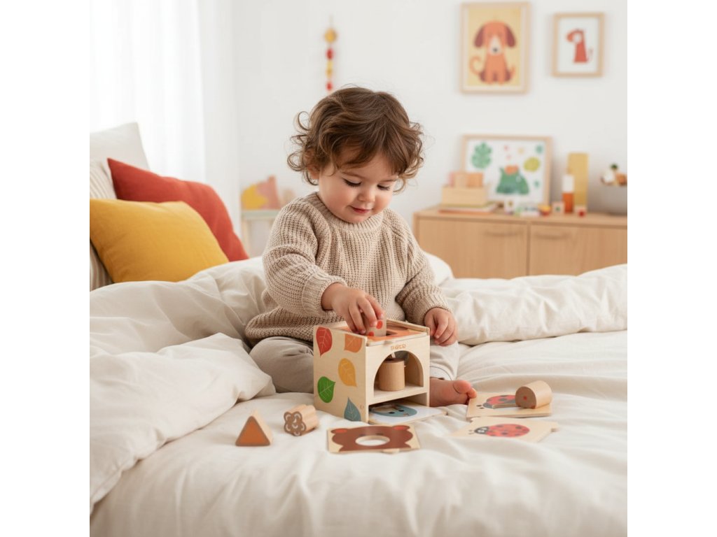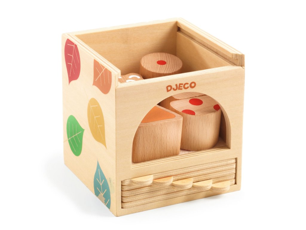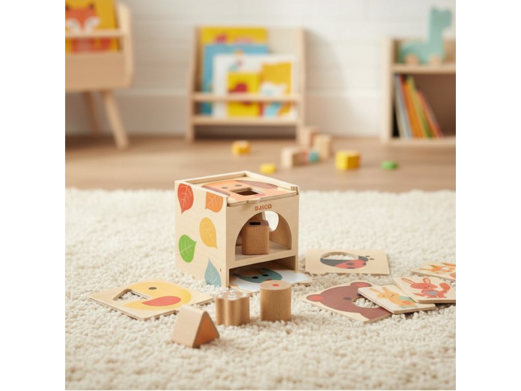 Vkladačka Posuvná Drevený posuvný triediaci box Originálny triediaci drevený box pre deti od 18 mesiacov vyrobený z FSC® dreva. Rodič vyberie dosku zvieratka s geometrickým otvorom (štvroec, kruh, polkruh, trojuholník alebo hviezdička) a zasunie ho navrh krabičky. Dieťa sa potom hrá vkladaním toho správneho z 5 tvarov pasujúceho do otvoru.Z certifikovaného dreva pre bezpečnú hru Výhody:• spodok krabičky je vystlaný plsťou pre menší hluk pri páde kusov• spodok krabičky je naklonený, takže kúsky sa dajú ľahko znova vytiahnuť• všetko sa zmestí do krabičky• umožňuje vášmu dieťaťu sústrediť sa na 1 tvar naraz• drevo s ekologickým certifikátom FSC®Obsah:• 1 box/krabička, 5 dosiek s otvormi a 5 drevených dielikov