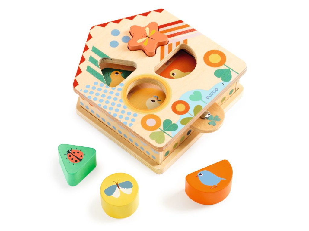 Vkladačka Zvieratá Drevený triediaci box v tvare domu Tento drevený triediaci box v tvare domu je ideálny pre deti od 18 mesiacov. Dieťatka zabaví vkladanie štyroch geometrických kúskov do zodpovedajúcich otvorov. Tento zábavný a vzdelávací produkt podporuje rozvoj jemnej motoriky a koordinácie očí a rúk. Keď dieťa zatiahne za uško, uvidí, ako všetky kúsky zmiznú naraz. Stačí opäť zatlačiť na uško a kúsky sa znova objavia mimo krabice, čo umožňuje opakovanú hru a nekonečnú zábavu.Z certifikovaného dreva pre bezpečnú hru Táto robustná vkladačka je vyrobená z kvalitného dreva s certifikátom FSC®, čo zaručuje bezpečnosť a ekologickú zodpovednosť. Kúsky sú navrhnuté tak, aby ich malé detské rúčky ľahko uchopili. Obsah balenia• jeden triediaci box • 4 geometrické tvary