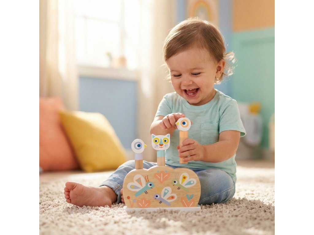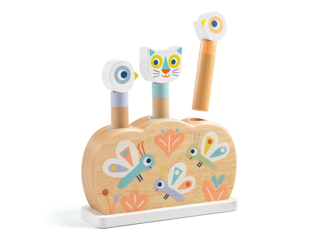 Vystrelovacia vkladačka Zvieratká Vystrelovacia vkladačka s farebnými zvieratkami Vystrelovacia vkladačka Zvieratká obsahuje rôzne farebné zvieratká, ktoré sa dajú vystreliť do vzduchu pomocou pružiny. Deti sa budú zabávať sledovaním, ako zvieratká lietajú a snažia sa ich chytiť. Vďaka kresbám pripomína lúku, na ktorej sa mačka a vtáčiky hrajú skrývačku – keď vyskakujú, vykúkajú z vysokej trávy. Vhodná pre deti od 3 rokov. Ideálny spôsob ako udržať malých nezbedníkov zaneprázdnených a aktívnych. Dieťa objavuje vlastnosti a správanie predmetov Ideálna hračka pre deti, ktoré milujú zvieratká a zábavu. Táto hra nielenže poskytuje veľa zábavy a radosti ale rozvíja aj koordináciu a zručnosť detí. Drevené kolíčky tejto hračky môže z ich základne jednoducho vytiahnuť, ale keď ich zatlačia, stane sa niečo úplné iné – vďaka pružine vyskočia. Ako vysoko alebo ďaleko vyskočia, keď zatlačí silnejšie alebo slabšie? V ktorom prste má vaše dieťa viac sily: v ukazováku alebo v malíčku? Ako to spraviť, aby vyskočili všetky kolíčky naraz?