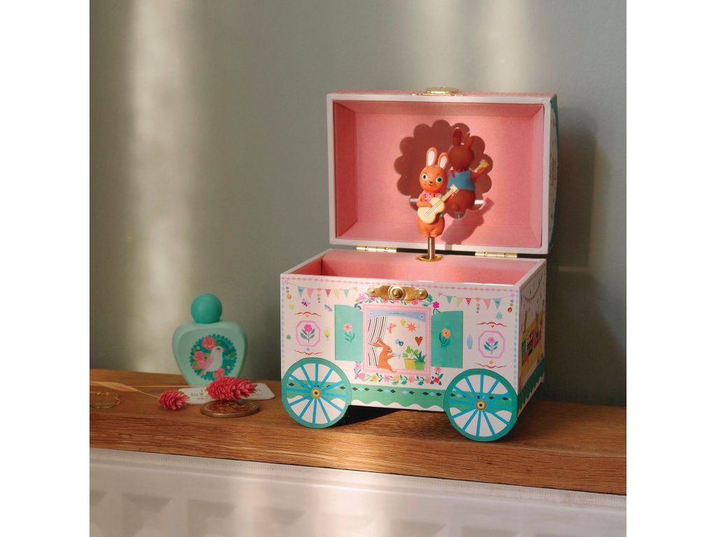 Začarovaný karavan: hracia skrinkaDrevená hudobná skrinka s otočnou figúrkou a úložným priestoromZačarovaný karavan – hracia skrinka je krásna drevená hudobná skrinka v tvare karavanu, ktorá hrá jemnú melódiu „Le temps des cerises“ (Antoine Ronzon) pri natiahnutí kľúčika a otvorení veka. Vo vnútri je zamatové vyloženie, zrkadielko v tvare kvetinky a roztomilá figúrka zajačika, ktorá sa pri hudbe otáča a vytvára kúzelnú atmosféru v detskej izbe. Skrinka zároveň slúži ako úložný priestor na drobné poklady alebo šperky.Prečo si vybrať hraciu skrinku od Djecojemná hudba pri natiahnutí kľúčika (asi 2 min 30 s)zamatový vnútorný priestor a dekoratívne zrkadielkofigúrka, ktorá sa otáča s hudboukrásny dekoratívny doplnok do detskej izby aj praktická šperkovnicaObsah baleniadrevená hudobná skrinka v tvare karavanu