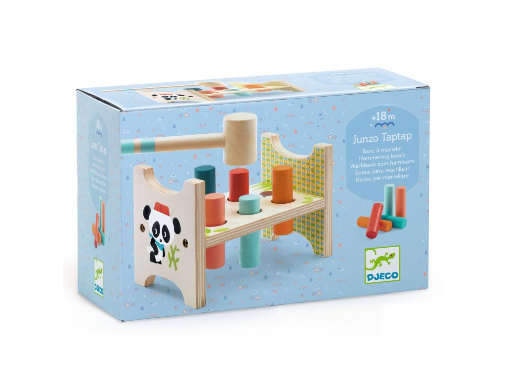 Zatĺkačka Junzo taptap Drevená zatĺkačka s otočnou doskouZatĺkačka Junzo TapTap je klasická motorická hračka značky Djeco pre najmenších, ktorá prináša jednoduchú, ale nesmierne obľúbenú aktivitu: dieťa vkladá 6 farebných valčekov do otvorov a pomocou kladivka ich zatĺka dovnútra.Najväčšia výhoda je obojstranná (otočná) základňa – keď sú všetky valčeky zatlčené, stačí podstavec otočiť a hra môže pokračovať odznova. Opakovaním dieťa prirodzene trénuje presnosť úderu, koordináciu oko–ruka, silu a kontrolu pohybu, zároveň sa učí rozoznávať farby a chápať princíp príčina–následok.Rýchly prehľad odporúčaný vek: 18m+ typ: drevená zatĺkačka (tap-tap) počet valčekov: 6 špeciálna funkcia: otočný/obojstranný podstavec na opakované hranie materiál: drevo rozmery hračky: približne 18 × 12 × 9,8 cm rozvíja: jemnú motoriku, koordináciu oko–ruka, sústredenie, farby, príčina–následokPrečo si ju deti zamilujú okamžitý „wow“ efekt – valček zmizne v otvore hneď po údere jednoduché pravidlá, ktoré pochopí aj malé dieťa otočná doska znamená zábavu stále dokola pevné drevené spracovanie, ktoré veľa vydržíAko to funguje Vlož farebné valčeky do otvorov. Podaj dieťaťu kladivko a ukáž jemné ťukanie. Zatlč valčeky dovnútra – sleduj, ako „prepadnú“ na druhú stranu. Otoč podstavec a začni znova.Obsah balenia 1× drevený podstavec (obojstranný/otočný) 6× farebný drevený valček 1× drevené kladivkoTechnické parametre značka: Djeco vek: 18m+ materiál: drevo rozmery: cca 18 × 12 × 9,8 cm