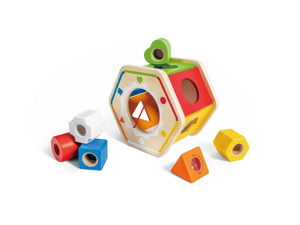 Svet farieb a tvarov vďaka drevenej vkladačke s geometrickými tvarmi od Hape. Celkom šesť dielikov má rôzne funkcie: trojuholník vydáva zvuky, kríž má zrkadlo a každý z ďalších 4 dielikov má iné farebné plexi. Deti sa počas hry učia o rôznych tvaroch a farbách. Rozmer balenia: 20x14x18 cm. Vek 12m+