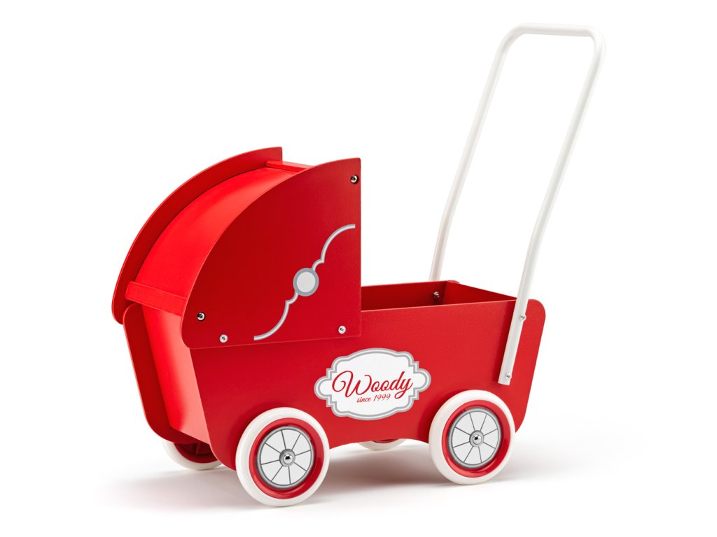 Drevený kočík v retro dizajne pre najmenšie dievčatká má vysokú rukoväť, gumové kolieska a hlbokú korbu, do ktorej sa bezpečne zmestí jedna ležiaca bábika do 40 cm alebo čokoľvek ďalšieho, čo potrebuje malé dieťa previezť | Vek: 3+ | Rozmer: 40,5 x 21,5 x 46,5 cm