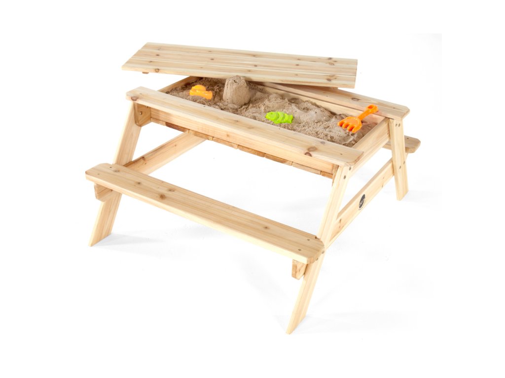 Drevený piknikový stôl 2v1 je priestorovo úsporný stôl vhodný na vonkajšie použitie. Zložením vrchnej dosky, ktorá slúži na písanie a kreslenie, vznikne plocha na hru s pieskom. Drevený piknikový stôl s lavičkami a pieskoviskom je vyrobený z robustného dreva čínskej jedle s certifikátom FSC. Drevo je ošetrené pred poveternostnými vplyvmi. Piesok nie je súčasťou balenia. Na naplnenie pieskoviska je potrebných cca 15-30 kg piesku. Pokiaľ pieskovisko nepoužívate, vždy ho zakryte Pravidelne kontrolujte piesok, či neobsahuje nečistoty a ostré predmety. Maximálna nosnosť: 50 kg. Rozmer balenia: 100 x 34 x 15 cm. Rozmer zostaveného stola cca 49 x 105 x 89 x cm. Vek: 18 m+