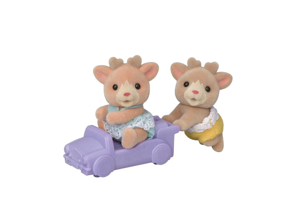 Dvojičky z rodiny sobov majú charakteristické roztomilé parôžky. Sada obsahuje dve malé figúrky dvojčiat Ollieho a Ginger pokryté mäkkým semišovým kožúškom a tiež vozítko v tvare auta. Dvojičky sú oblečené do zábavných, farebných oblečkov s čipkou. Vozítko je možné kombinovať s vozidlami z iných sád s dvojčatami. Hračky Sylvanian Families rozvíjajú predstavivosť a podporujú deti na hranie rolí. Hranie s figúrkami Sylvanian Families rozvíja kreativitu a učí emócie prostredníctvom vytvárania a rozprávania príbehov na základe každodenných skúseností a pozorovaní sveta. Vyznačujú sa najvyššou kvalitou a výnimočným dôrazom na detaily. Figúrky Sylvanian Families majú pohyblivú hlavu. Oblečenie je vyrobené tak, aby sa dalo opakovane vyzliekať a obliekať. Balené v krabičke. Rozmery balenia: 12 x 7,5 x 3,5 cm. Vek: 3+
