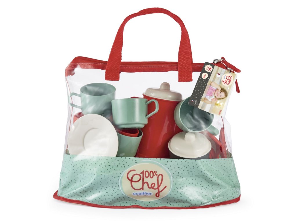 Veľká priehľadná taška so zipsovým zatváraním obsahuje štyri taniere, súpravu štyroch príborov, štyri poháriky, štyri plastové hrnčeky s podšálkami, kanvičku, cukorničku, sitko a hrniec s pokrievkou. Všetko plastové. Vhodné pre deti od 18 mesiacov. Veľkosť tašky 29x12x30 cm.