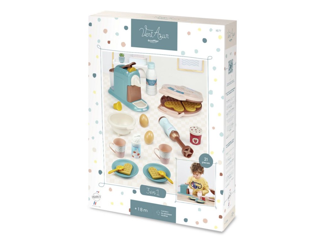 Sada 3 v 1 na prípravu raňajok obsahuje 3 spotrebiče - kávovar, vaflovač a tyčový mixér. Súčasťou sady sú doplnky: 4 vafle, miska, 2 vajcia, 2 kapsule do kávovaru, 2 šálky, fľaša mlieka, plechovka šľahačky a pohár džemu. Rozmery výrobku: 22,5 x 17 x 14 cm.