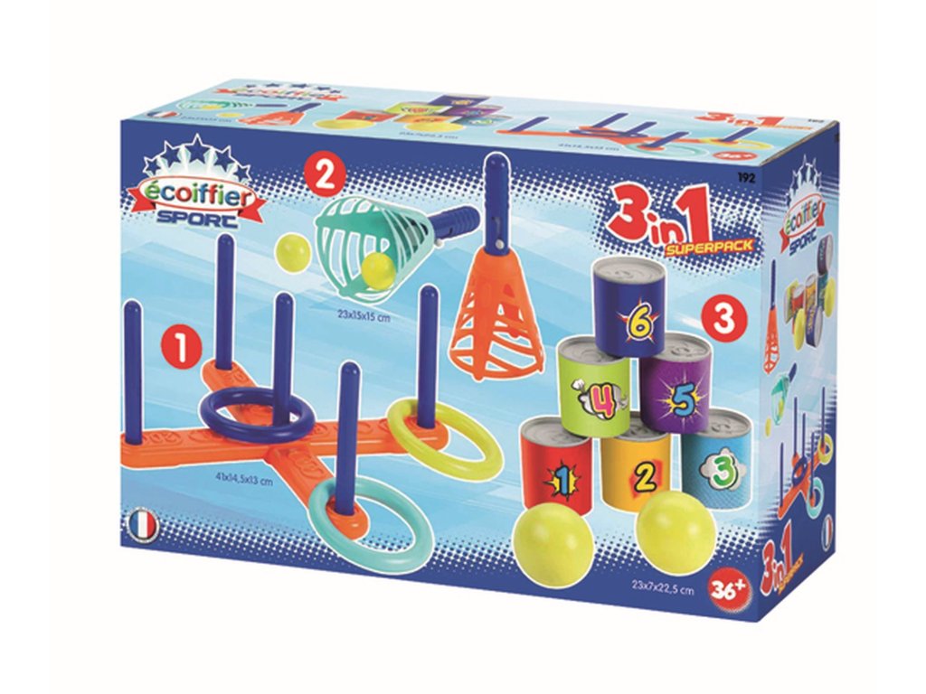 Súprava 3 obľúbených hier vhodných do interiéru i exteriéru - chyť loptičku, krúžky na kríž a zhadzovanie plechoviek. Všetko je plastové, vyrobené vo Francúzku.