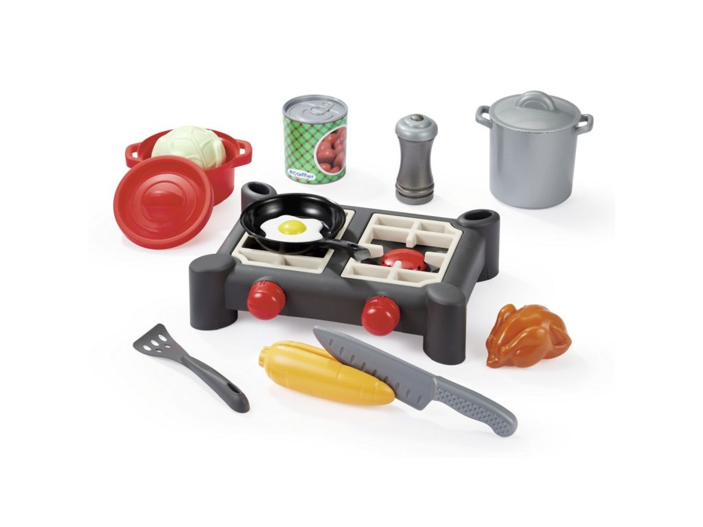 Dvojplatničkový varič so sadou hrncov s pokrievkami, rajnicami, panvičkou, potravinami a ďalším príslušenstvom. Súprava obsahuje 14 ks. Rozmery variča 21 x 17 x 5 cm.