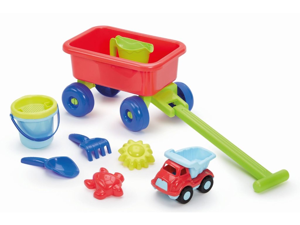 Vozík s kanvičkou a setom na piesok. Súčasťou vedierko, sitko, hrabličky, lopatka, 2 formičky. Nechýba ani autíčko - sklápačka. Rozmery vozíka: 69,5 x 20 x 20,5 cm (s držadlom).