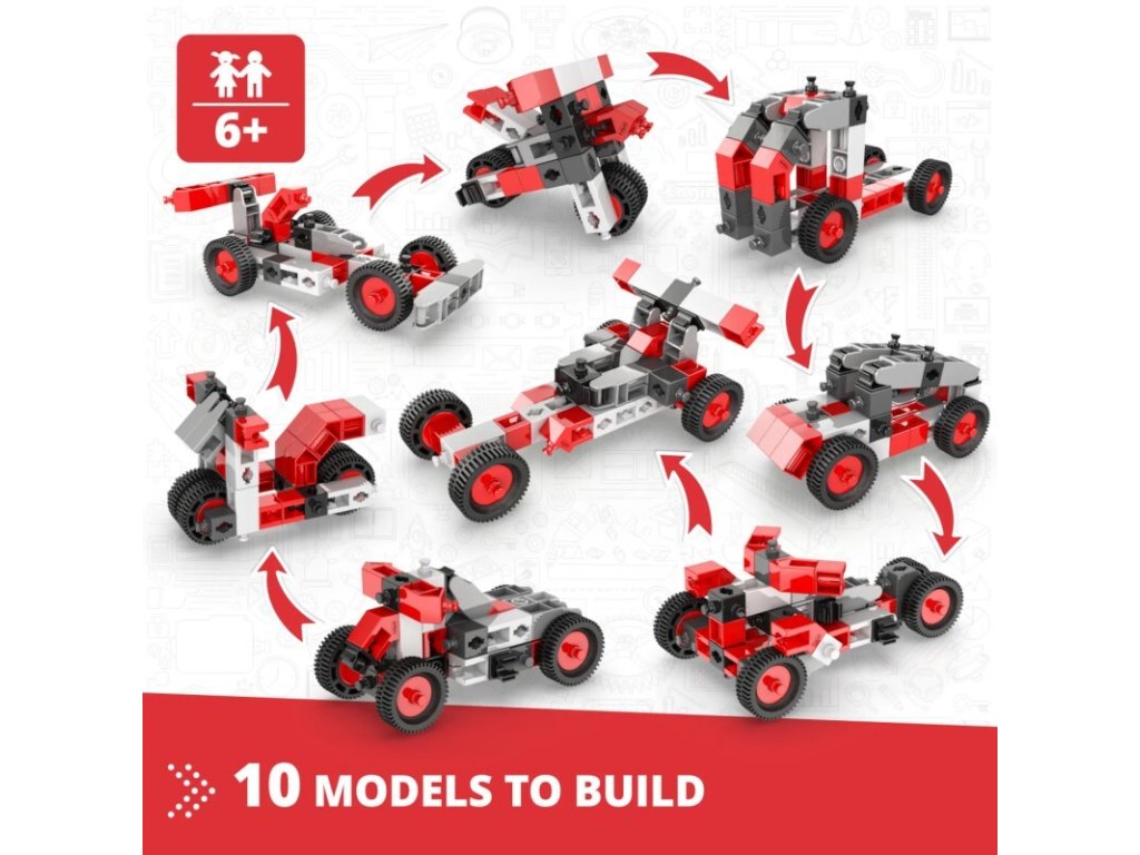 Všetky naše sady od 30 modelov a vyššie obsahujú nový 2-rýchlostný motor ENGINO pre animované stavby, od áut cez žeriavy až po dinosaury a helikoptéry. Jediným limitom je fantázia dieťaťa!