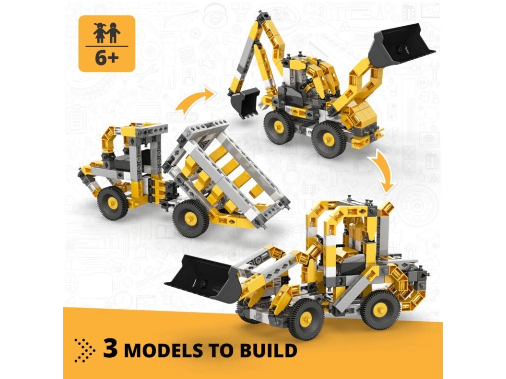 Mladí milovníci nákladných vozidiel stavajú svoje obľúbené ťažké úžitkové vozidlá JCB a dláždia cestu budúcnosti v oblasti STEM (veda, technika, inžinierstvo a matematika) s touto praktickou stavebnicou STEM.