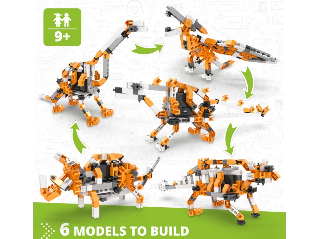 Postav si 5 motorizovaných modelov dinosaurov, ako je brontosaurus, stegosaurus, triceratops, pterodaktyl a ankylosaurus, a uveď ich do pohybu.