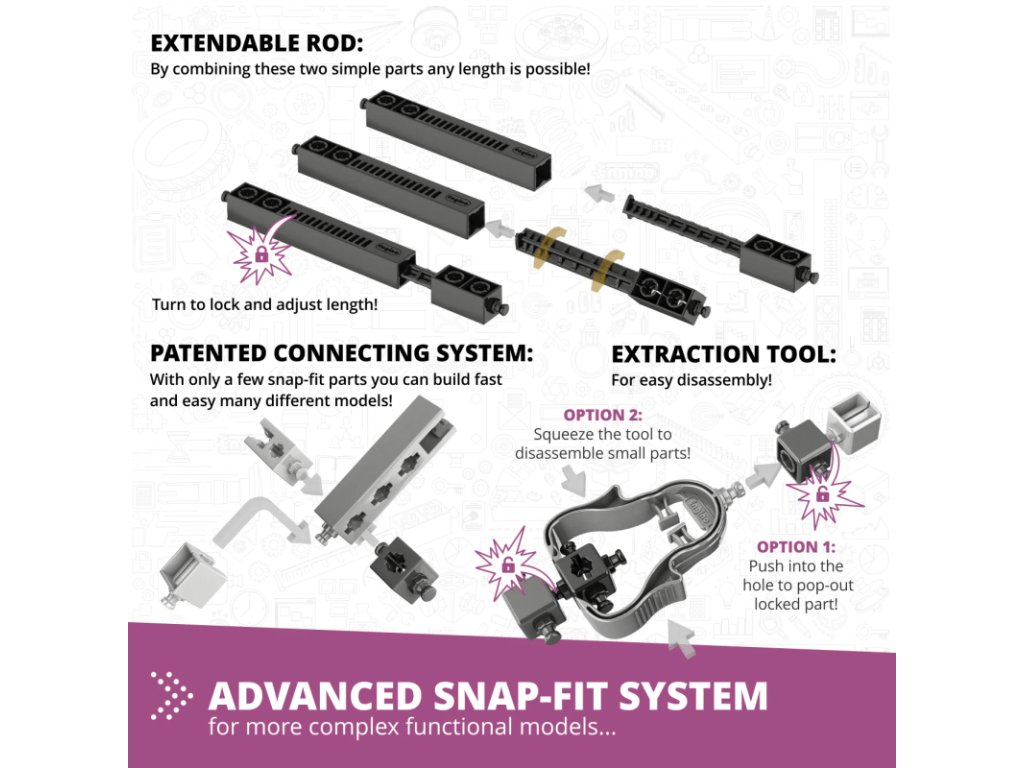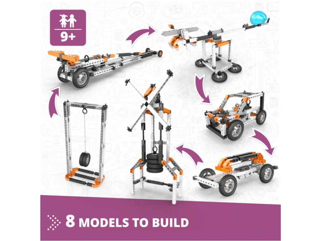 Postavte si 8 funkčných modelov, ako je balistický katapult, gravitačný ventilátor, kolízne auto, pohyblivá kabína, lietadlo poháňané balónom a dragster.