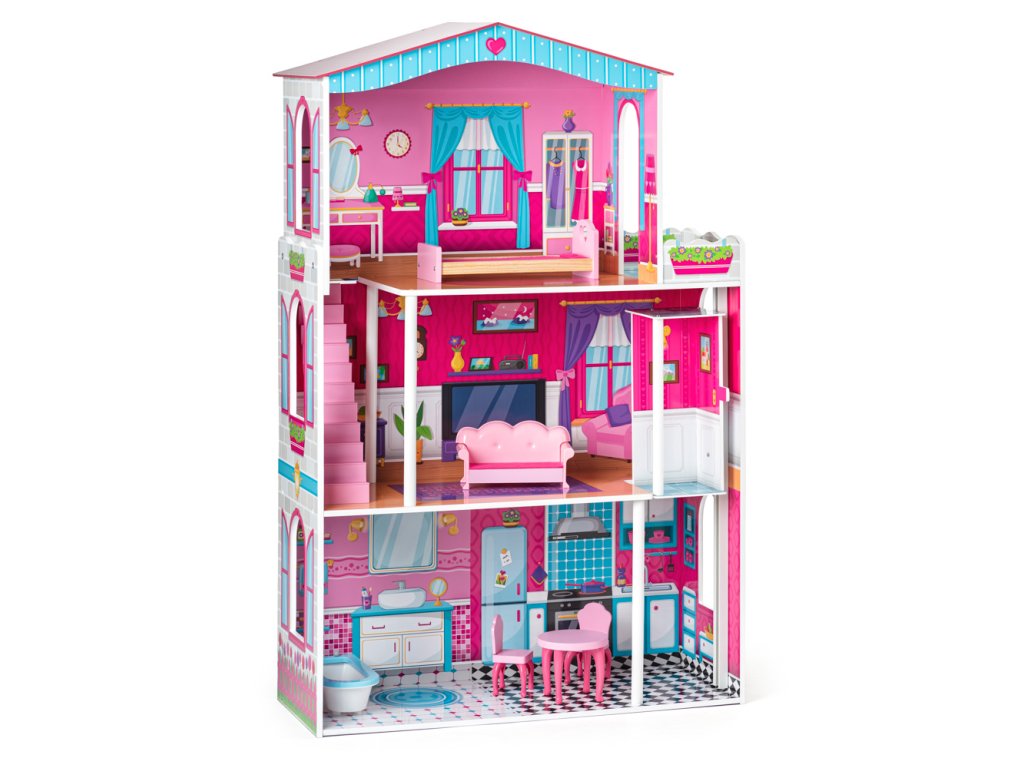 Nový dizajn domčeku vznikol v spolupráci s českou výtvarníčkou a na prvý pohľad zaujme svojou farebnosťou. Tento kvalitný trojposchodový domček je určený pre bábiky typu Barbie (30 cm) a dodávame ho vrátane zobrazeného príslušenstva (7ks). Nábytok je vyrobený z kombinácie materiálov drevo/plast/textil. Z prízemia na prvé poschodie sa môžu bábiky zviezť výťahom. Bábiky nie sú súčasťou výrobku. Príslušenstvo domčeka: kreslo so stolíkom, stôl a dve stoličky, posteľ, vaňa. Rozmery: 74,5 x 30 x 116cm. Veková kategória: 3+
