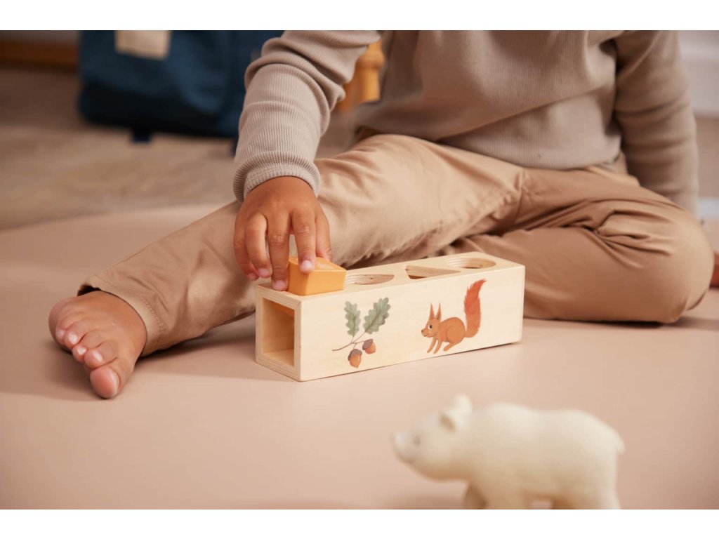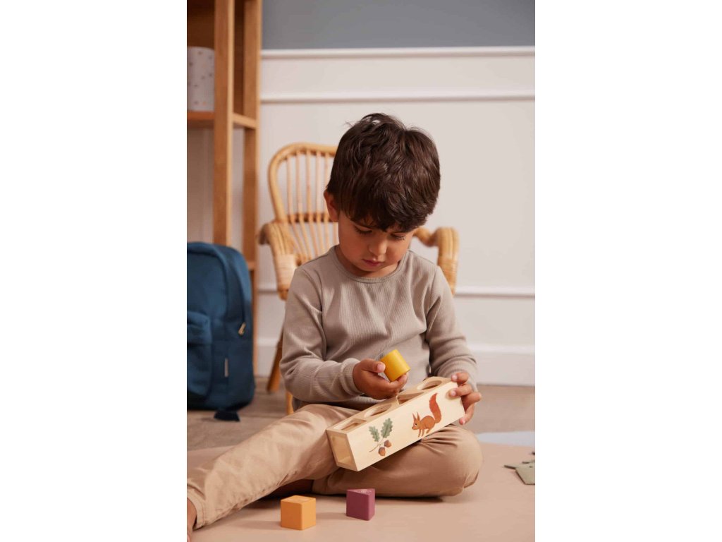 Box na triedenie tvarov podporuje rozvoj úrovne jemnej motoriky, ktorá je nevyhnutným predpokladom pre koordináciu oko-ruka. Dieťatko sa vďaka dreveným kockám môže zoznámiť s prvými tvarmi a farbami.
