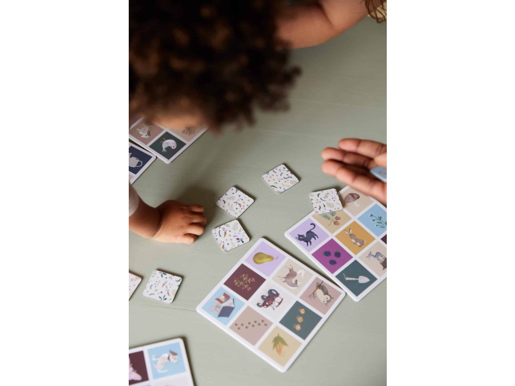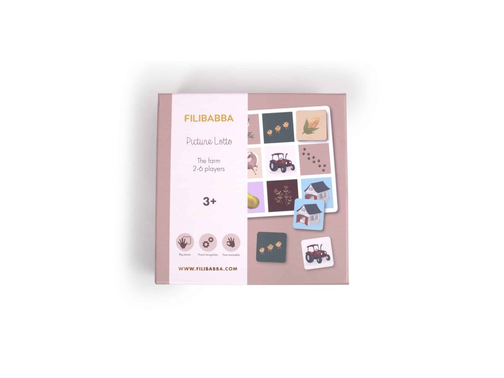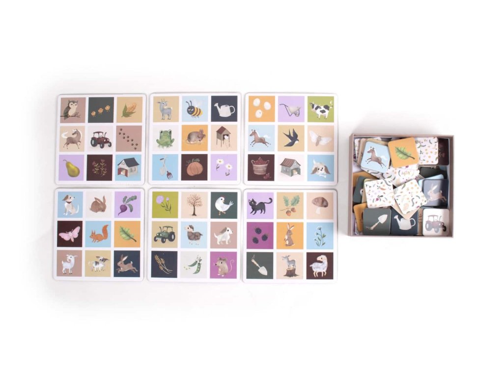 Obrázková lotériová hra obsahuje 6 dosiek a 54 hracích figúrok s farebnými ručne kreslenými ilustráciami zobrazujúcimi roztomilé zvieratká a obľúbené prvky zo života na farme.