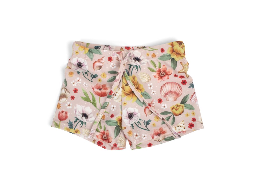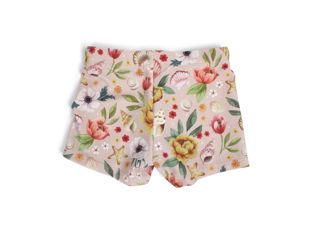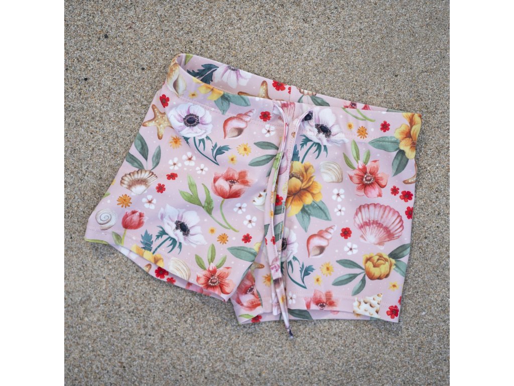 Všimnite si, ako motív Ocean Blossom zachytáva poklady, ktoré deti rady zbierajú a nosia si ich domov. Každý lupienok a každý drobný detail je ručne kreslený jemnými akvarelovými ťahmi, takže každý pohľad na plavky je ako malý dobrodružný príbeh.